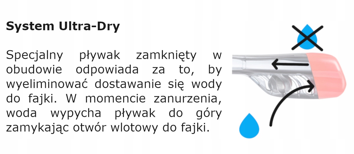 System Ultra-Dry - Specjalny pływak zamknięty w obudowie odpowiada za to, by wyeliminować dostawanie się wody do fajki. W momencie zanurzenia, woda wypycha pływak do góry zamykając otwór wlotowy do fajki.