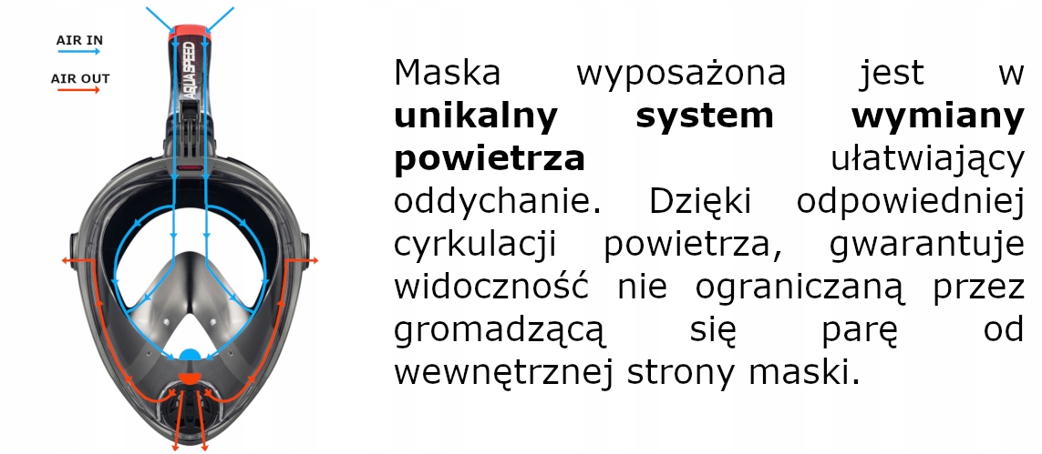 Unikalny system odprowadzania powietrza - Maska posiada dwa zawory wylotowe zlokalizowane na bokach ramki maski. Dzięki temu cały przekrój fajki znajdującej się na górze maski odpowiada jedynie za pobieranie powietrza co znacznie poprawia swobodę oddychania.