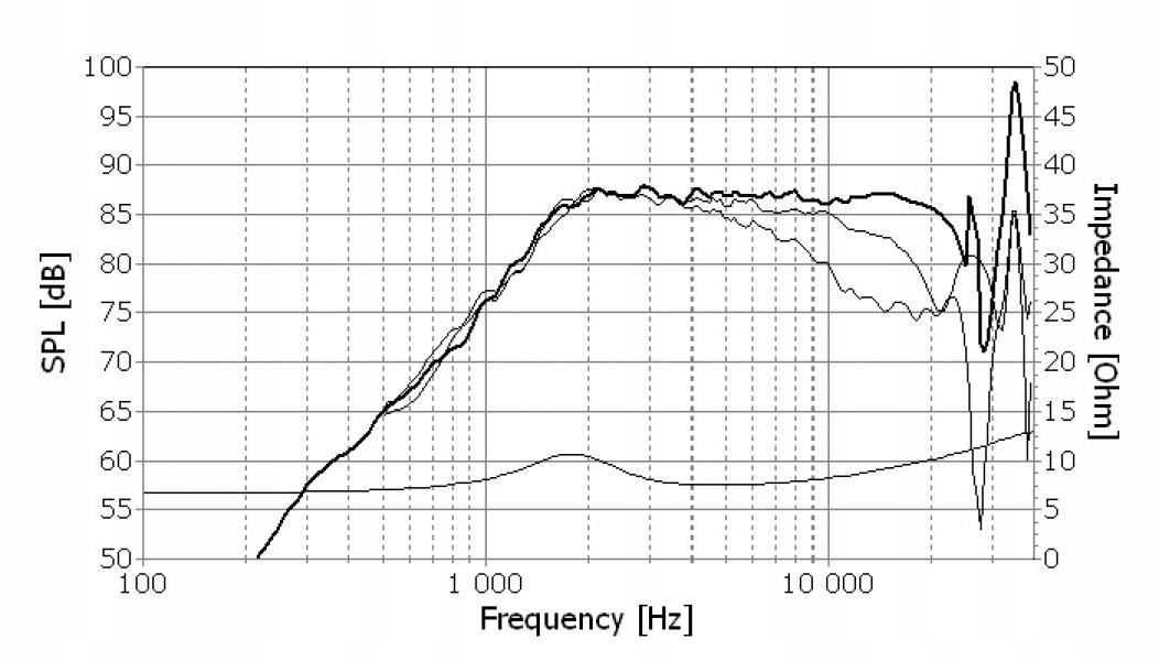 19-milimetrowy głośnik wysokotonowy High Fidelity o gładkiej, rozszerzonej częstotliwości odpowiedź. Aluminiowa membrana zawieszona na specjalnie zaprojektowanej miękkiej obudowie Sonotex co pozwala na niską częstotliwość podstawową. Formowana wtryskowo obudowa z wysokiej jakości tworzywa sztucznego wzmocnionego włóknem szklanym utrzymuje ruchome części są idealnie wyrównane i zapewniają dobre połączenie z obudową. Starannie zaprojektowany dyfuzor chroni membranę i kompensuje niewielkie osiowe odchylenie w kierunku 20 kHz. Uzwojenia cewki drgającej zanurzone w płynie magnetycznym zwiększają krótkotrwałą obsługę mocy pojemność i zmniejszyć kompresję przy wysokich poziomach mocy.