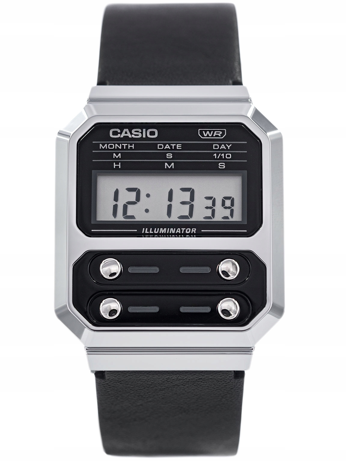 Na cyferblacie umieszczony został wyświetlacz cyfrowy, pod którym znajdują się przyciski.