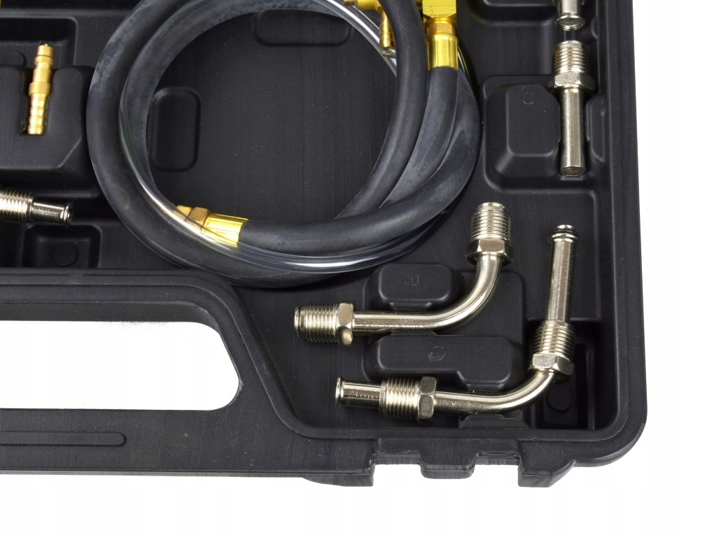 Wielofunkcyjny zestaw do pomiaru ciśnienia spalania benzyny. Zestaw współpracuje z większością samochodów marek japońskich, amerykańskich i europejskich. Zestaw zawiera adaptery i kształtki pasujące do większości układów wtrysku paliwa. Manometr z podwójną skalą: 0 - 140 psi oraz 0 - 10 bar. Długi elastyczny przewód wraz zaworem odpowietrzającym pozwala na bezpieczny pomiar ciśnienia.