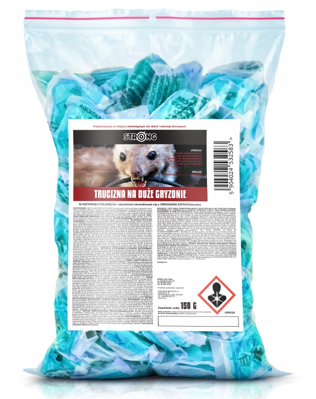 STRONG TRUCIZNA NA DUŻE GRYZONIE to silny preparat gryzoniobójczy skuteczny przeciw trudnym do zwalczania gryzoniom. Preparat dzięki smakowitym składnikom mieszkanki jest wykrywany przez szkodniki nawet ze znacznej odległości, a dzięki zawartości sprawdzonej substancji czynnej - BRODIFACOUM - jest w 100% śmiertelny już po jednorazowym spożyciu.