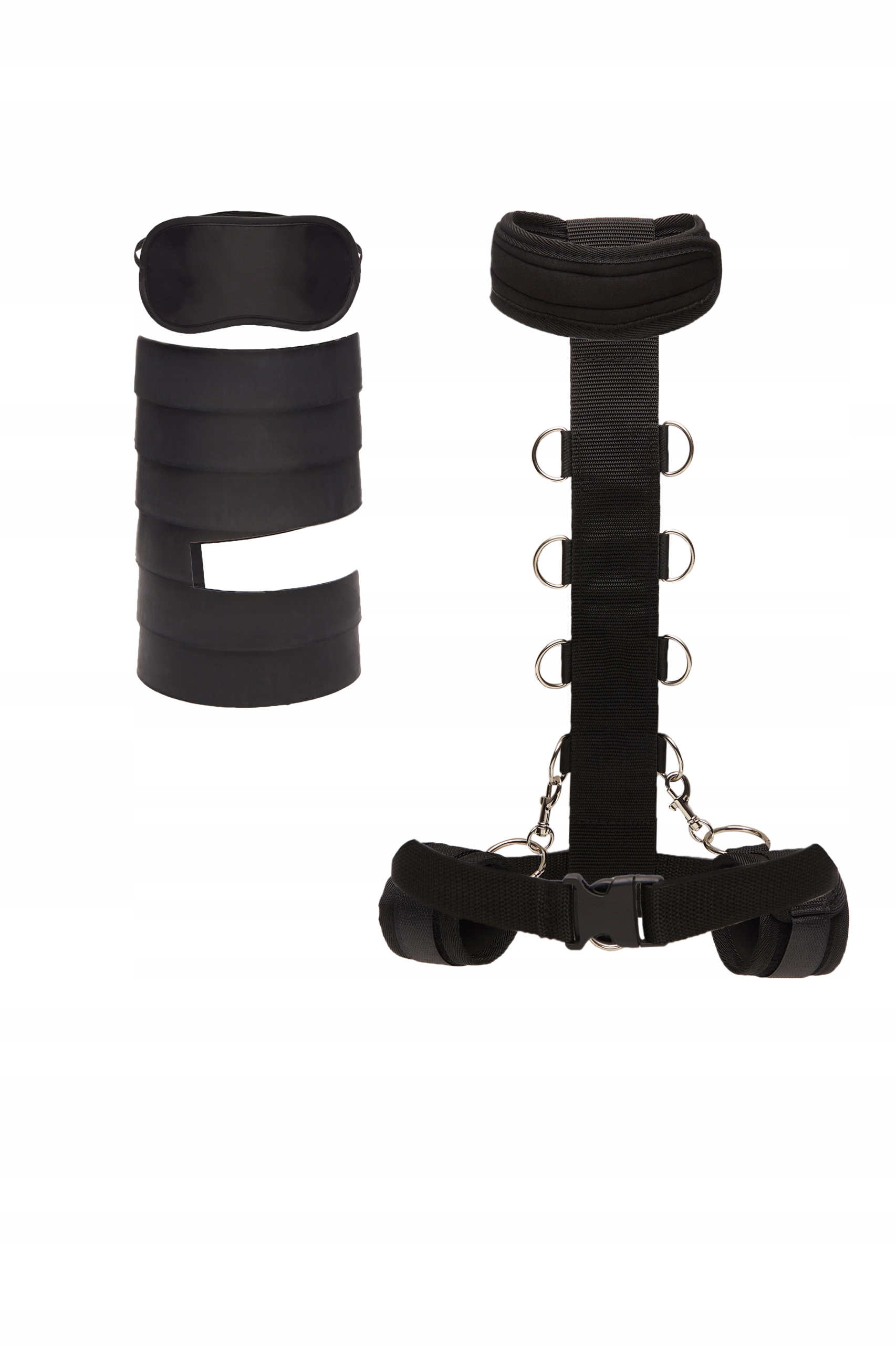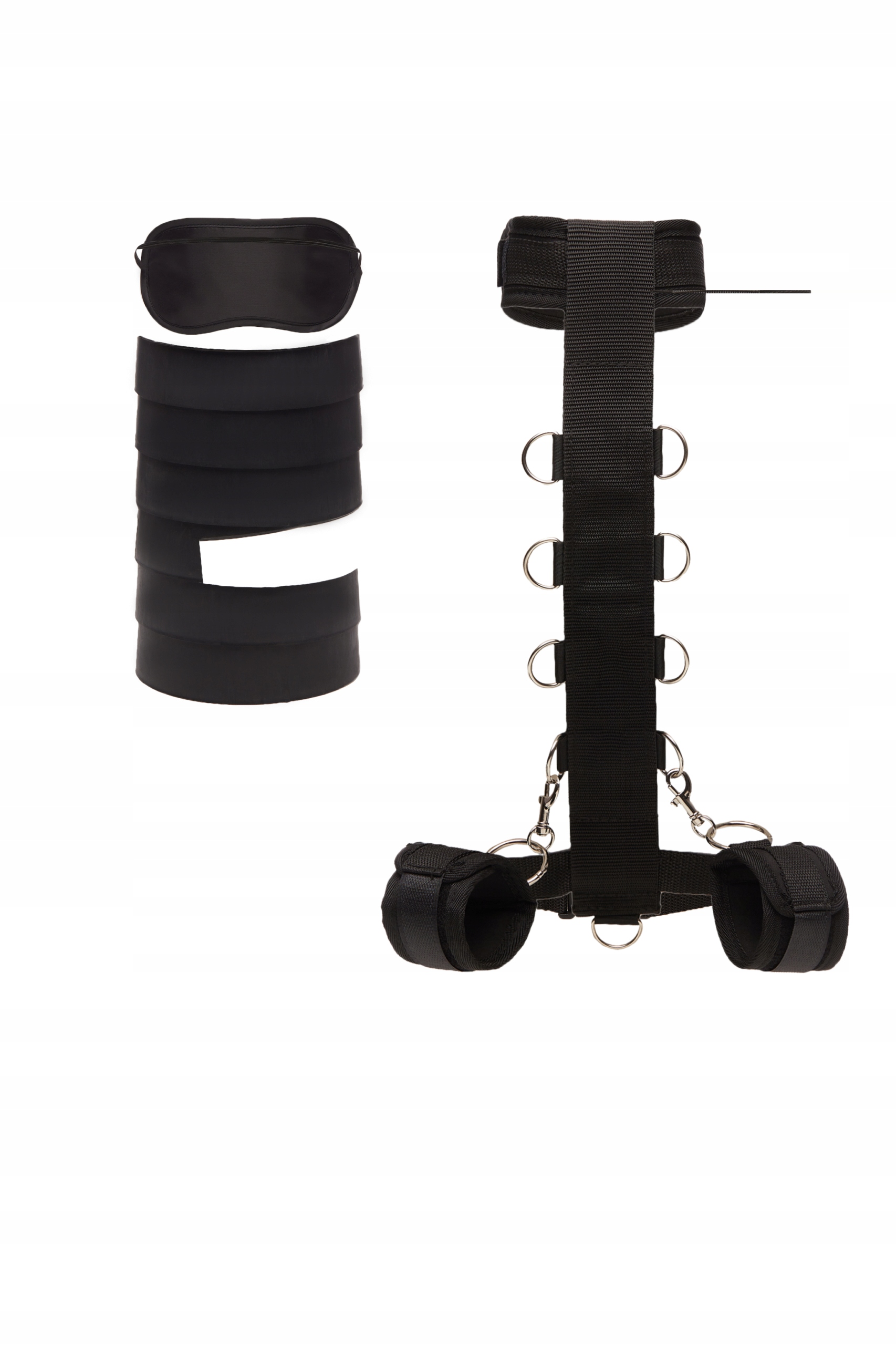 Zestaw bondage do krępowania podczas zabaw erotycznych składa się z kołnierza i kajdanek, wykonany jest z mocnych pasów. Kołnierz jest przymocowany do mankietów za pomocą paska, rozmiar mankietów można regulować, dając możliwość wygodnego dopasowania. Uprząż ma miękką elastyczną strukturę i nie pozostawia śladów na ciele.