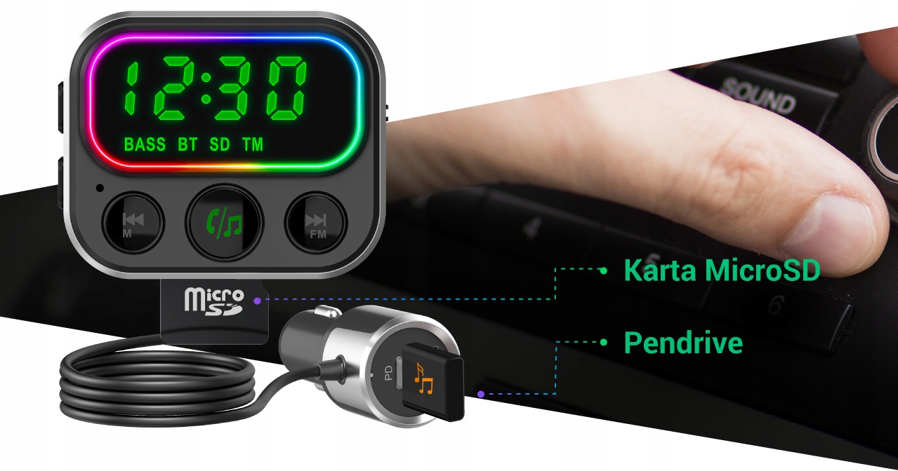 С помощью передатчика вы также можете воспроизводить песни, хранящиеся на USB-накопителе или карте microSD, в машину. Подключите USB-накопитель к левому USB-разъему или вставьте карту памяти в слот, и Воспроизведение MP3-файлов начнется автоматически.