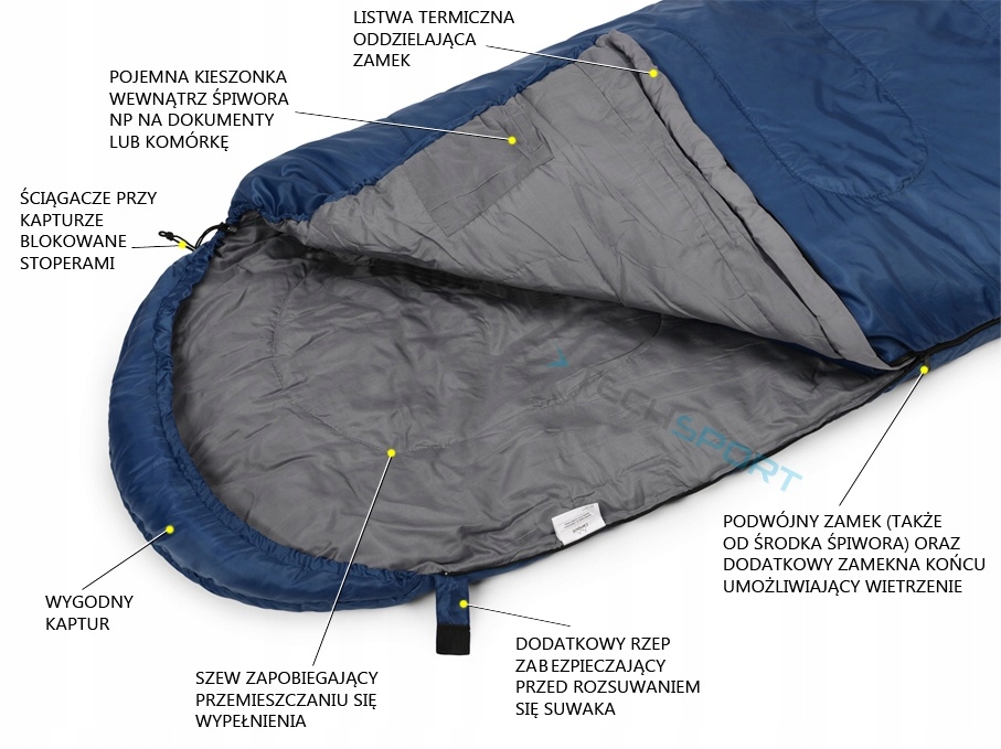 Wysokiej jakości ciepły śpiwór Cougar 350 typu 2w1 (połączenie mumii i kołdry) firmy Campus. Model Cougar to połączenie śpiwora typu kołdra z mumią, dzięki temu posiada ich wszystkie zalety (stałą szerokość na całej długości śpiwora oraz wygodny kaptur), nie tracąc przy tym na swoich właściwościach i parametrach. Takie rozwiązanie pozbawia go podstawowych wad zwykłych modeli: braku kaptura w kołderce i wąskiego dołu śpiwora w mumii. Dodatkowo zamek rozpina się na całej długości dwóch boków, po rozpięciu można zrobić z niego standardową kołdrę. Charakteryzuje się bardzo dobrymi właściwościami, najwyższą jakością wykonania oraz opatentowanymi technologiami takimi jak struktura wypełnienia: Hollowfiber i nowoczesne tkaniny poliestrowe. Dzięki temu uzyskuje realne ekstremum na poziomie -9st. Posiada dwubiegowy zamek, umożliwiający rozpinanie również od dołu oraz regulację temperatury w śpiworze. System ANTI-BITE zabezpiecza materiał przed wcinaniem w zamek. Praktyczny pokrowiec posiada dodatkowo pasy kompresujące. Śpiwór nowy, oryginalny z kompletem metek.