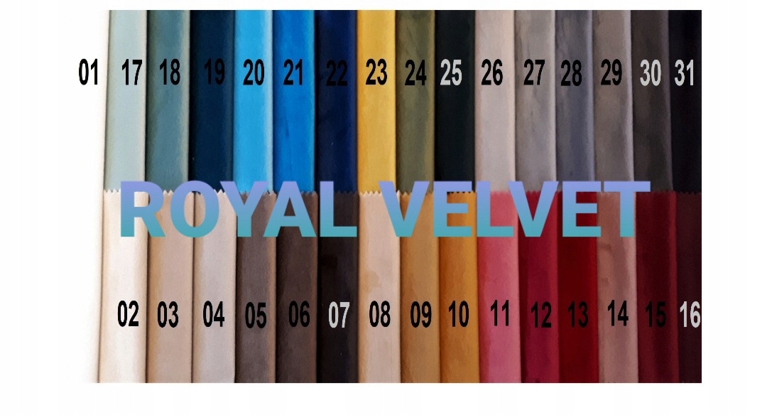 ROYAL VELVET- gęsta tkanina meblowa typu welwet, niezwykle miękka i aksamitna w dotyku. Tkanina tapicerska bardzo odporna na ścieranie. Idealna do stosowania na meblach i dekoracjach: zasłony, kotary ,panele,pufy,poduszki itp.