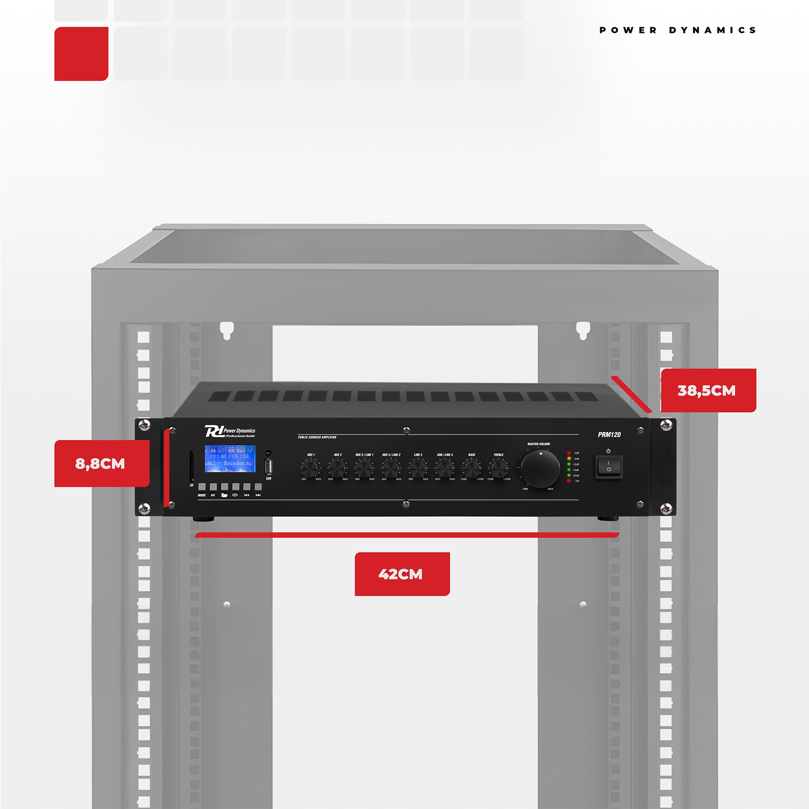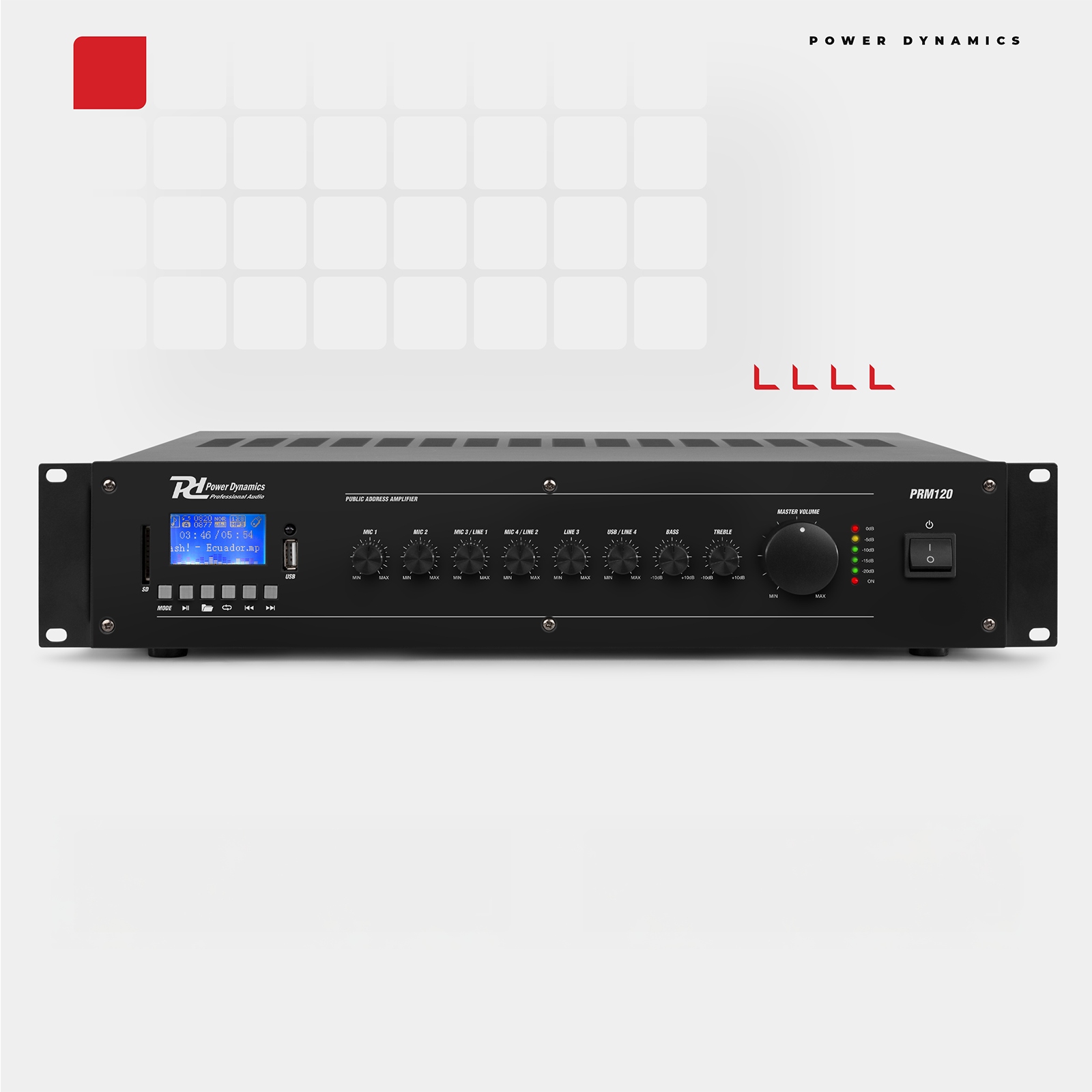 Power Dynamics PRM120 to kompaktowy i wydajny wzmacniacz 100V o mocy 120W, przeznaczony do profesjonalnych instalacji nagłośnieniowych w przestrzeniach komercyjnych i przemysłowych.