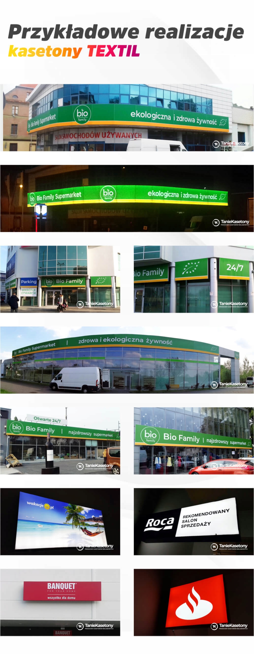 Kasetony reklamowe TEXTIL zbudowane są z profilu aluminiowego, lica materiałowego z drukiem UV 2xCMYK w trybie do podświetleń oraz tyłu z płyty typu dibond. W standardzie w każdym kasetonie montujemy pionowe poprzeczki wzmacniające, przez które kaseton montowany jest na podłożu. Ten rodzaj kasetonów produkujemy w maksymalnym wymiarze 600x200cm. Ze względu na prawie niewidoczną ramkę kasetony TEXTIL idealnie nadają się do montażu we wnękach lub do zabudowy modułowej.