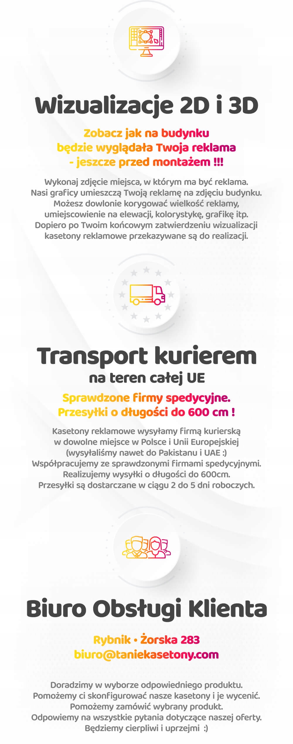 Plik z grafiką do kasetonu (skala 1:1, kolory CMYK, spłaszczony - 1 warstwa, 150-200dpi, kompresja LZW) można przesłać do nas przez e-mail lub WeTransfer.