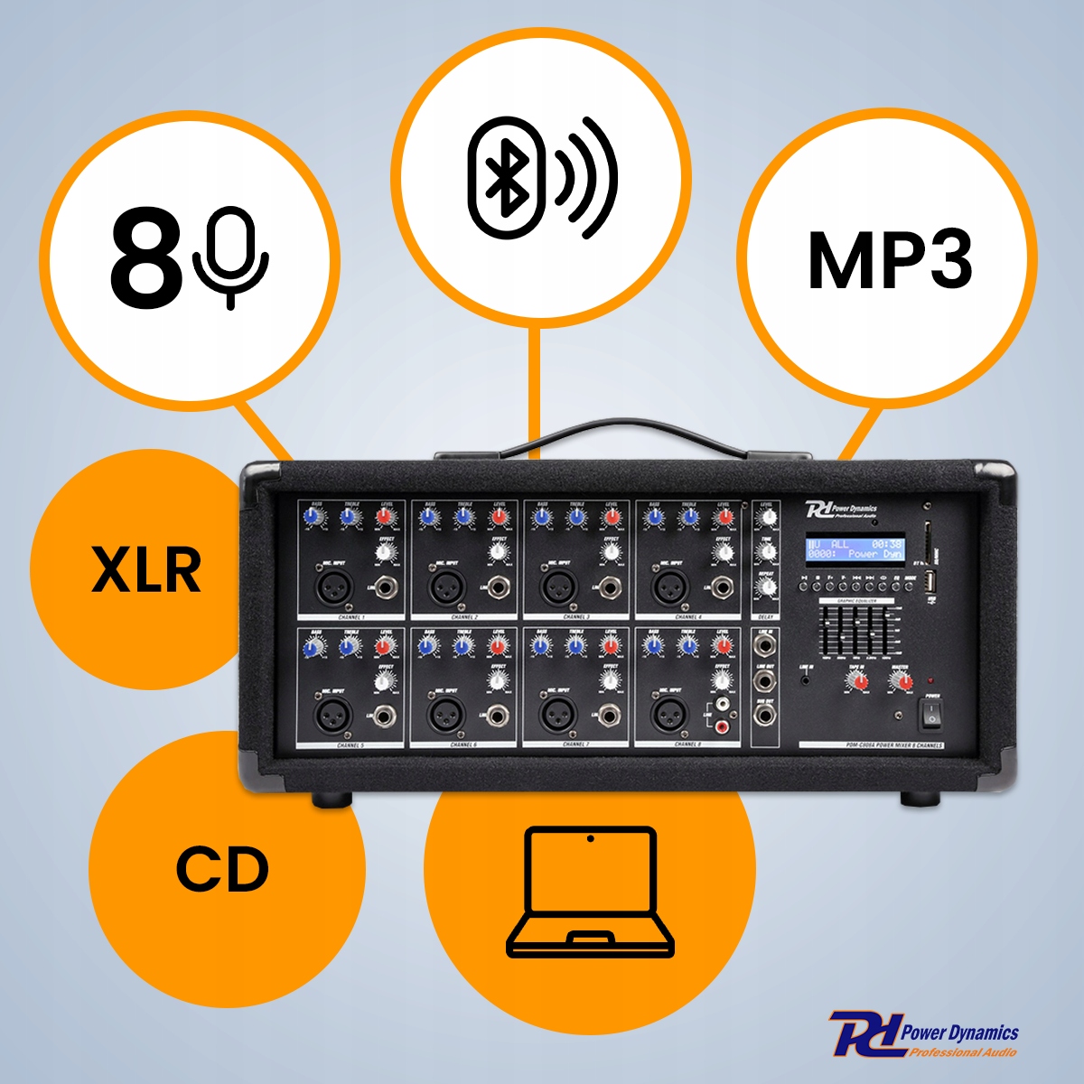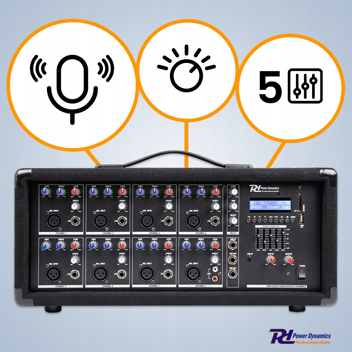 Power Dynamics PDM-C805A to 8-kanałowy mikser z wbudowanym wzmacniaczem do wielu zastosowań (na żywo). Dzięki 8 kanałom masz wiele możliwości podłączenia mikrofonów lub innego sprzętu audio. Dodatkowym atutem jest odbiornik Bluetooth oraz wewnętrzny odtwarzacz MP3, który sprawia, że odtwarzanie muzyki (lub zespołu orkiestrowego) jest bardzo łatwe. Całość jest całkowicie kompaktowo zabudowana w rodzaj walizki z poręczną rączką, dzięki czemu można ją łatwo zabrać ze sobą.