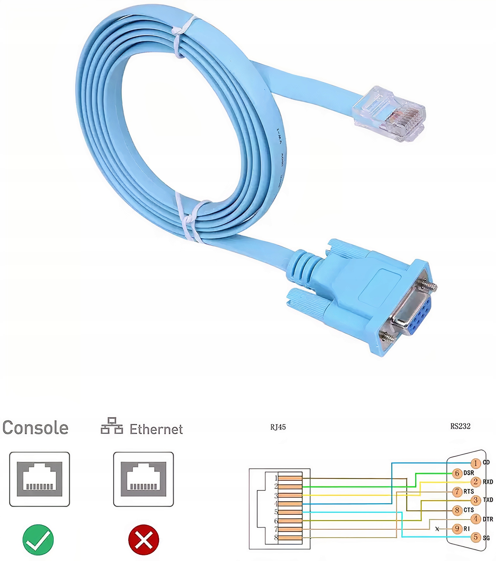 Przedmiotem oferty jest kabel do urządzeń sieciowych z portem konsolowym RJ-45 oraz wtyczką DB9 (RS232 - port szeregowy). Kabel służy do podłączenia komputera lub innego urządzenia terminalowego do urządzeń sieciowych w celu dostępu i konfiguracji. możliwia bezpośrednie łączenie się do urządzeń (routerów, przełączników, access pointów WiFi) m.in. firmy Cisco, Juniper, HP i innych.