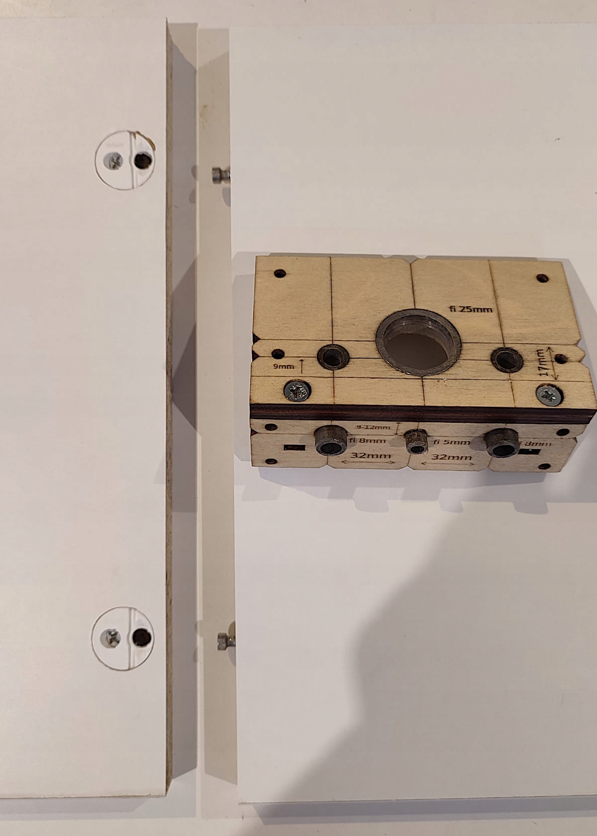 Zbudowany z dwóch płytek połączonych pod kątem 90 stopni. Pozwala zarówno na nawiercenie otworu pod mimośród (fi 25mm) jak pod trzpień i ewentualnie kołki fi 8mm.