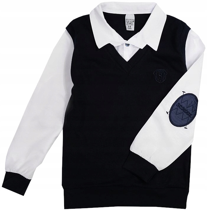 Белая рубашка с воротником и длинным рукавом, с отделкой в рубчик, на локтях декоративные нашивки, для рубашки пришит сплошной темно-синий пуловер, низ также отделан ребром.