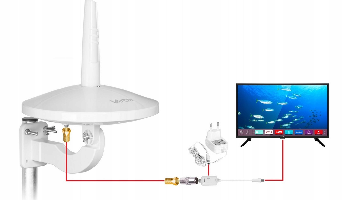 W zestawie z anteną znajdują się wszystkie akcesoria niezbędne do podłączenia anteny.