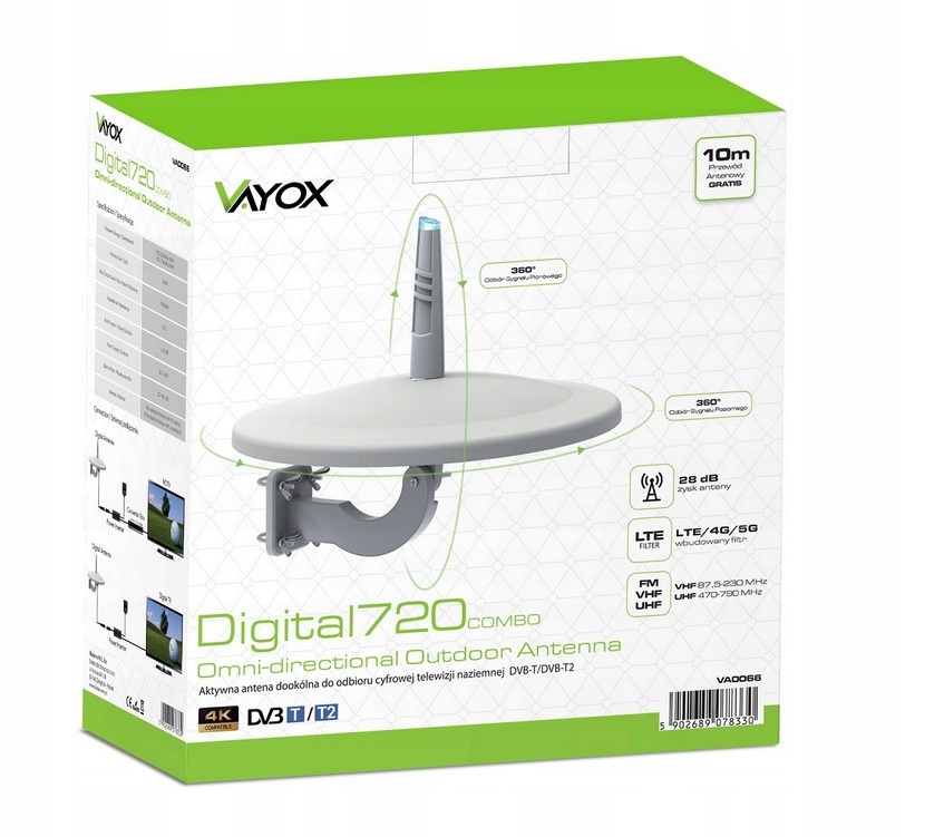 Antena dookólna model 720combo jest przystosowana do obioru kanałów DVB-T2 w jakości 4K.