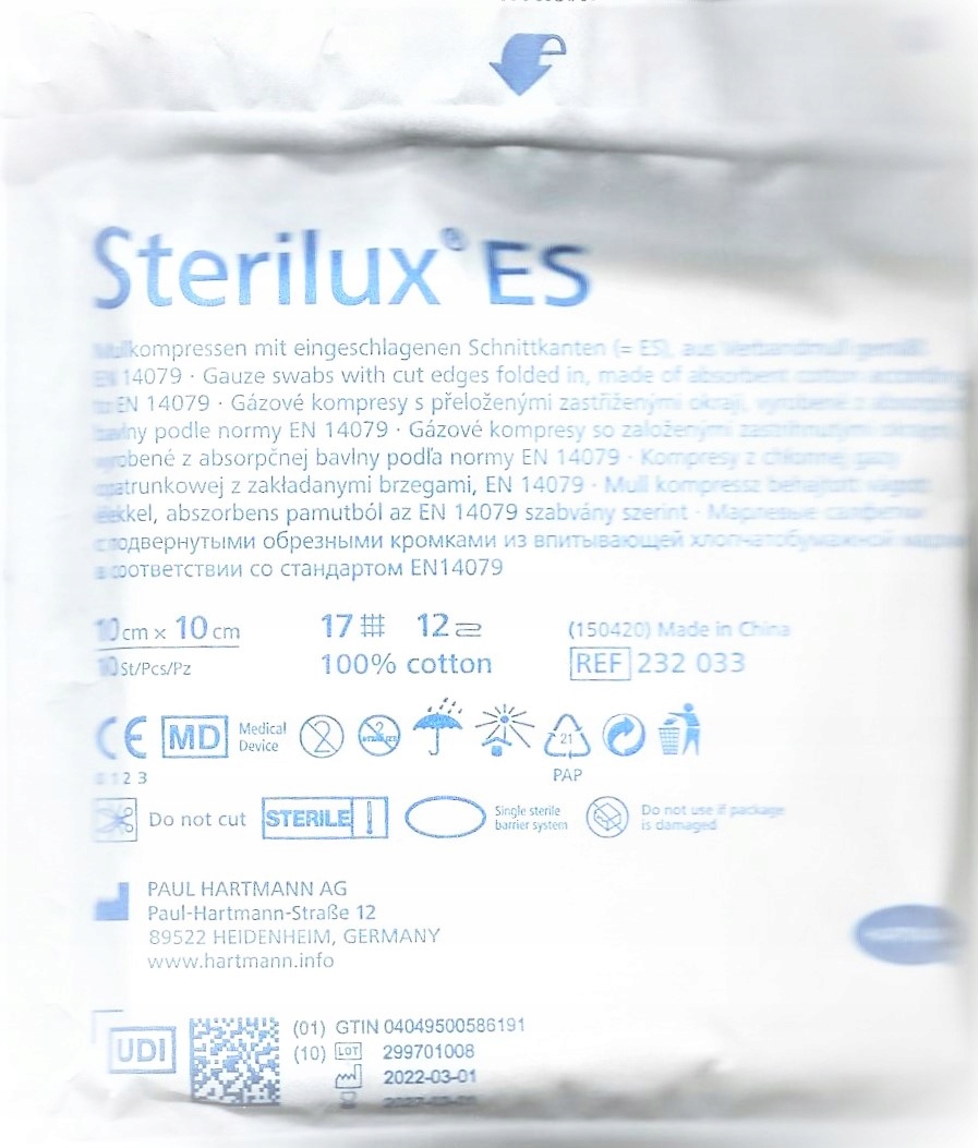 HARTMANN - Sterilux ES to jałowe, 17-nitkowe, 12-warstwowe kompresy z chłonnej gazy bawełnianej z podwijanymi brzegami EN 14079.