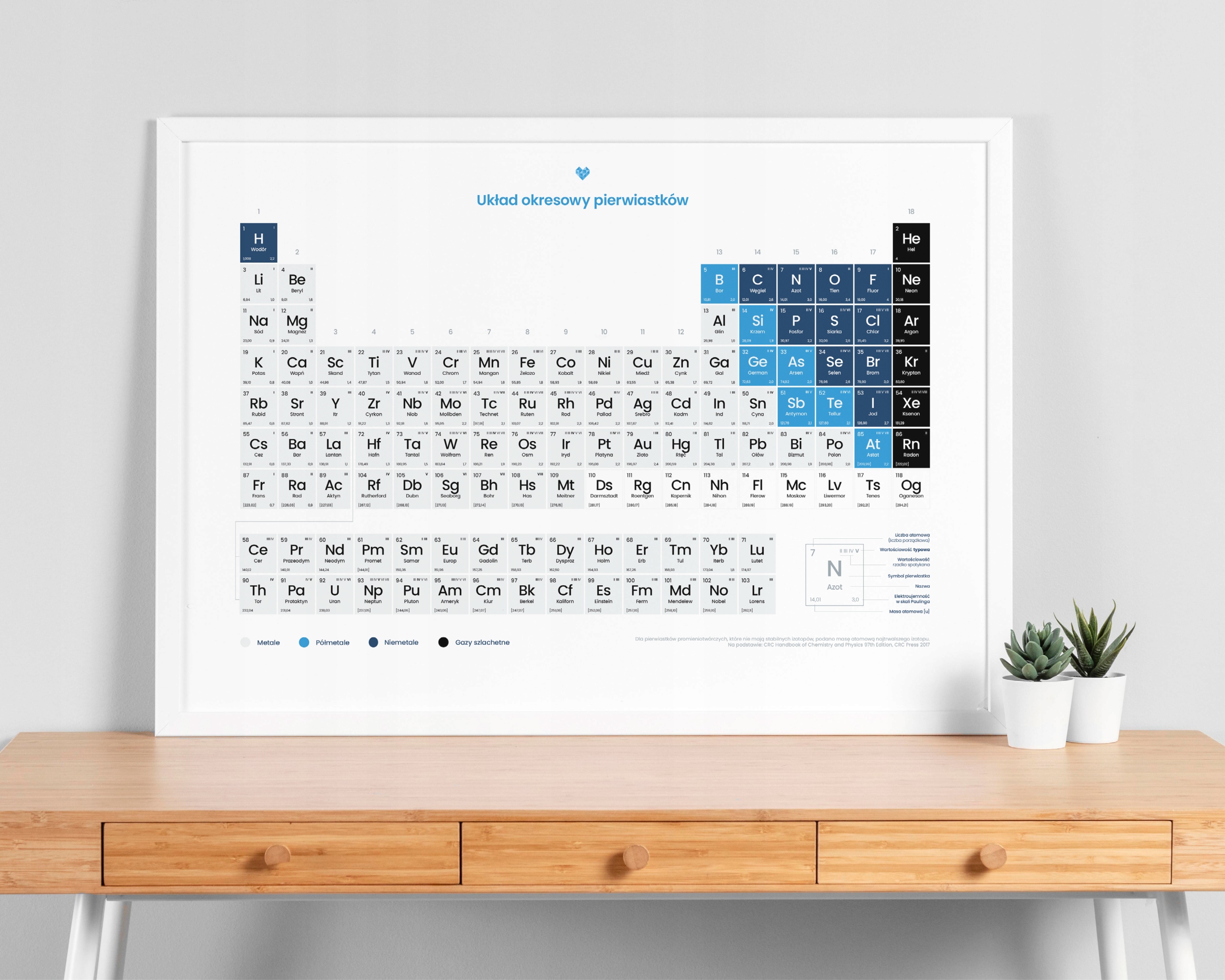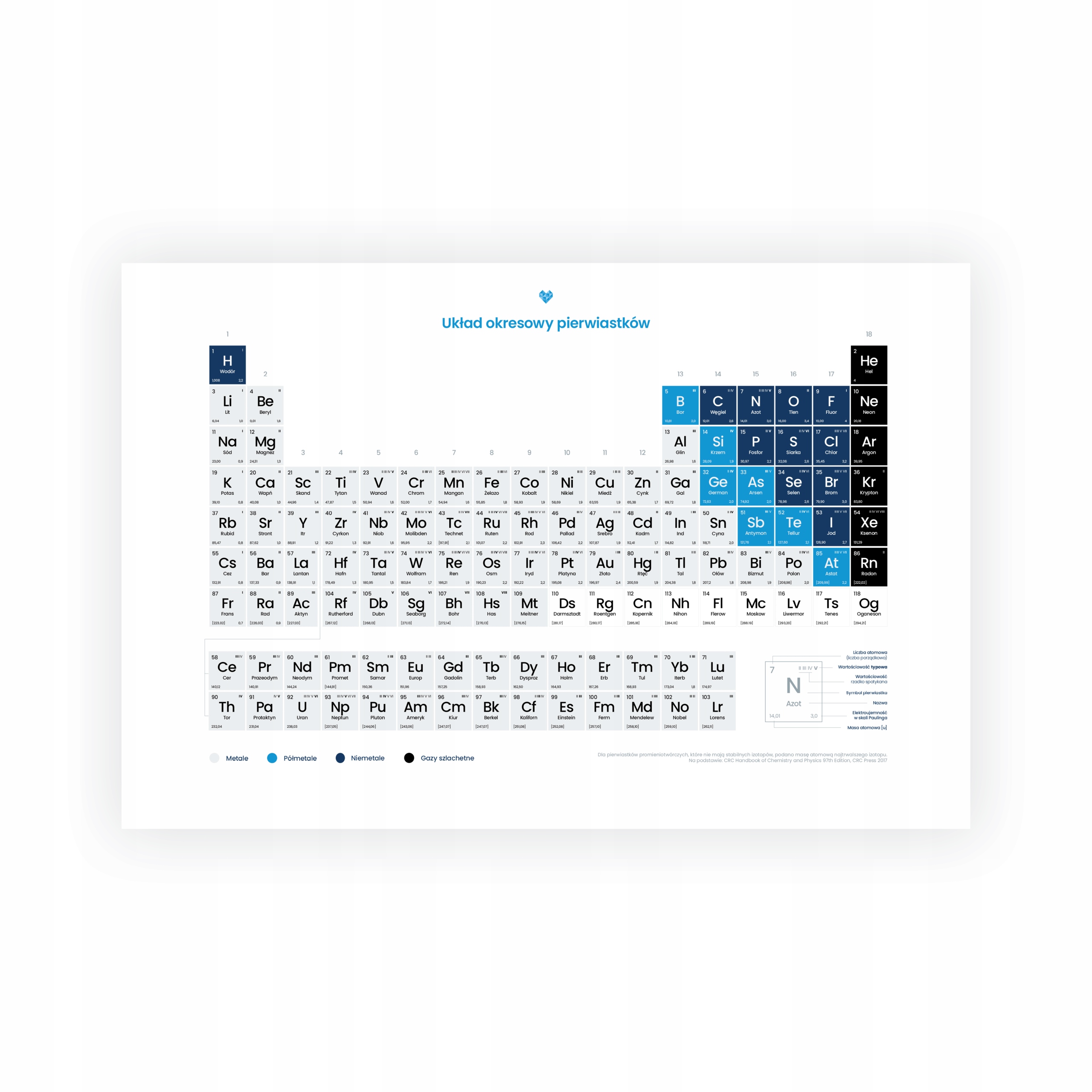ŚWIETNA POMOC NAUKOWA – Plakat ten został zaprojektowany na podstawie obowiązujących tablic wydanych przez Centralną Komisję Egzaminacyjną. W układzie znajdziesz symbol każdego pierwiastka, jego nazwę, masę atomową, liczbę atomową, elektroujemność w skali Paulinga, wartościowość, a także wyraźny podział na metale, półmetale, niemetale i gazy szlachetne.