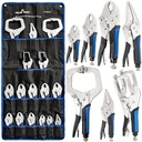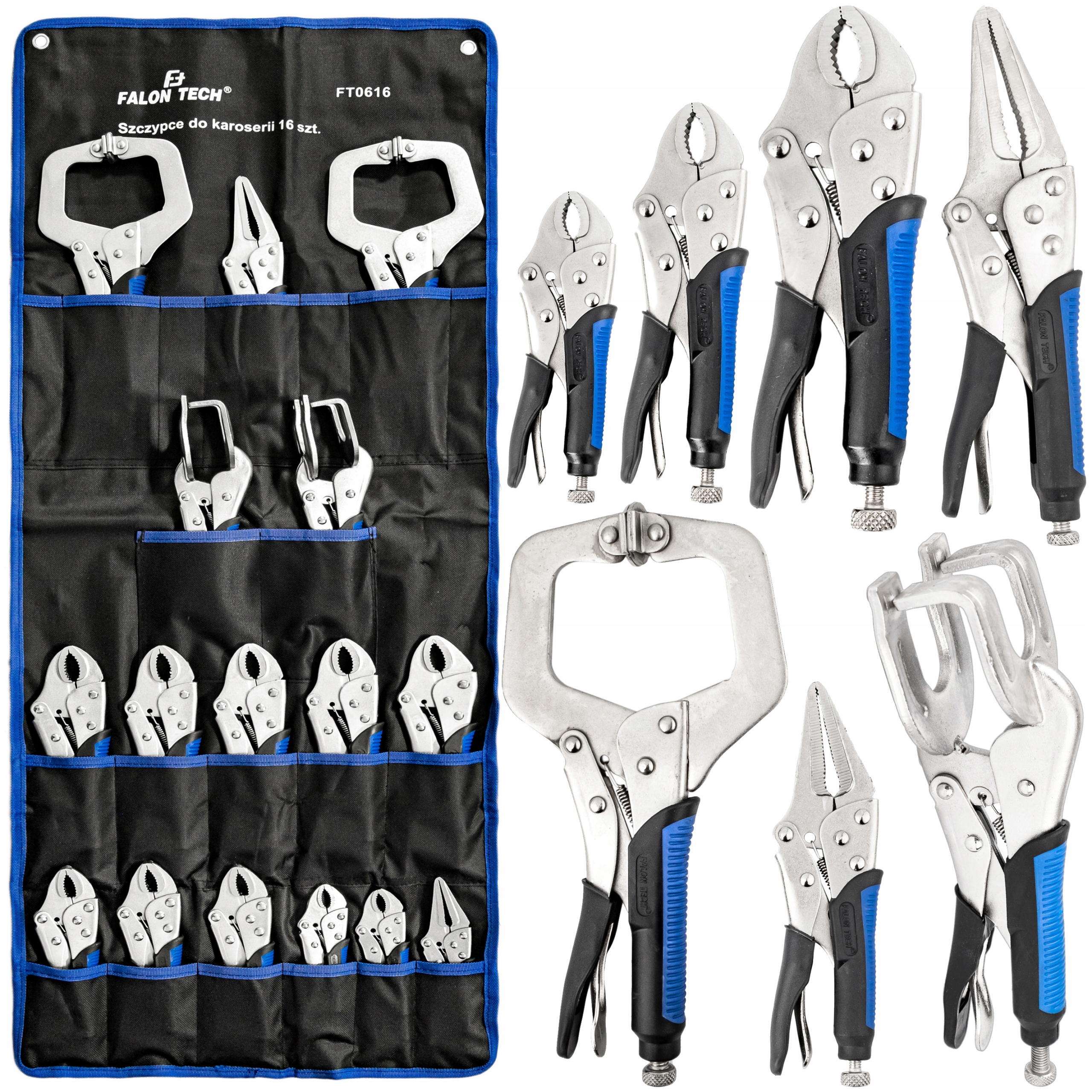 Specjalny zestaw szczypiec samozaciskowych przeznaczonych do prac blacharskich lub spawalniczych. Zestaw składa się z 16 elementów.