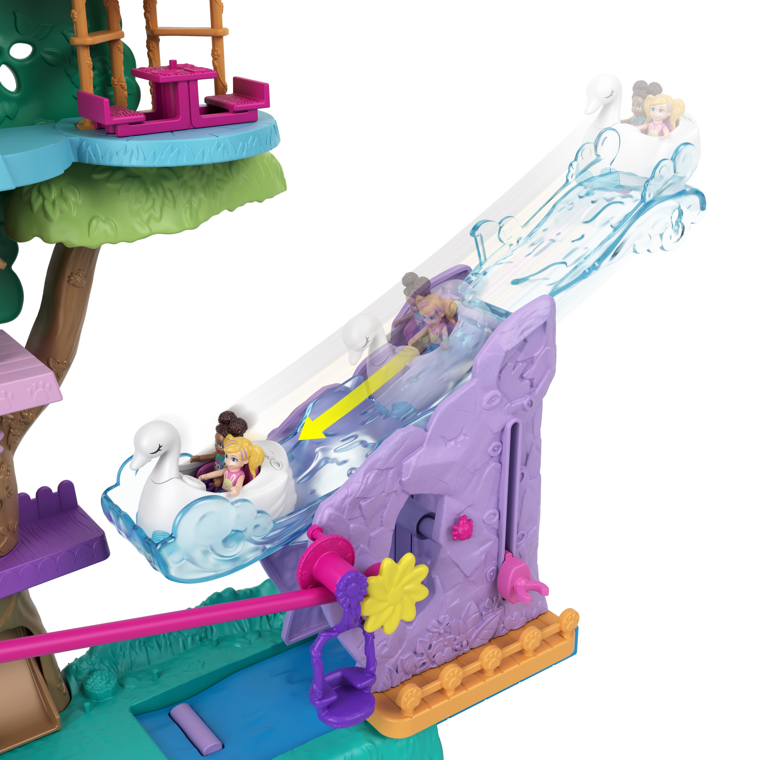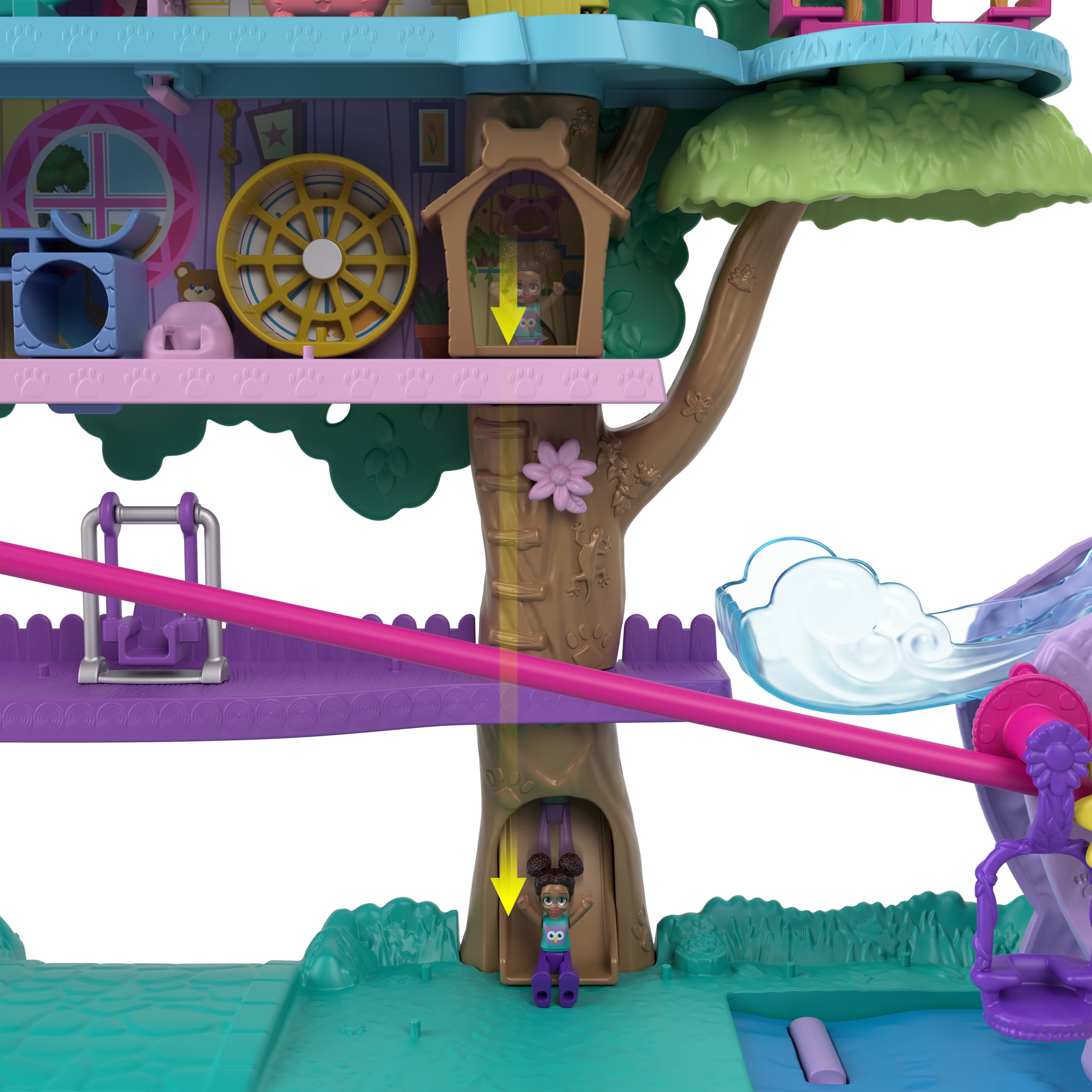 Zestaw Polly Pocket Pollyville Przygody zwierzątek - Domek na drzewie jest pełen dynamicznej zabawy. Odkryj pięć poziomów zabawy oraz niepowtarzalny sposób powiększania zestawu, aby bawić się w superdużym domku na drzewie. W środku znajdziesz mikrolalki Polly i Shani, 4 urocze figurki zwierzątek, 9 akcesoriów do zabawy ze zwierzątkami i 1 łabędziowy pojazd. Zacznij zabawę, przejeżdżając łabędziowym pojazdem po progu zwalniającym, aby rozłożyć zestaw i aktywować tyrolkę. Przejedź po drugim progu zwalniającym, aby rozłożyć wodospadową zjeżdżalnię. Odkrywaj niespodzianki i obszary zabawy na pięciu poziomach, takie jak ukryta zjeżdżalnia w psiej budzie, punkt widokowy na czubku drzewa, ścianka wspinaczkowa, balon do "latania", huśtawka w kształcie koszyczka i sekretne miejsce do przechowywania. Kolory i elementy dekoracyjne mogą się różnić. Wspaniały prezent dla dzieci od 4 roku życia.