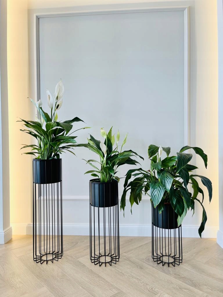 Zestaw kwietników metalowych stojących z osłonką czarną lub białą, Nowoczesny Design LOFT wysokość 71cm, 56cm i 42 cm