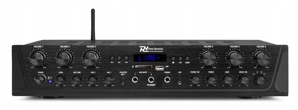 Power Dynamics PV260BT to 6-strefowy стереоусилитель, с помощью которого громкость 6 зон можно регулировать отдельно. Спасибо PV260BT вы создадите многозонную стереосистему для своего дома, офиса, столовой и т. д.