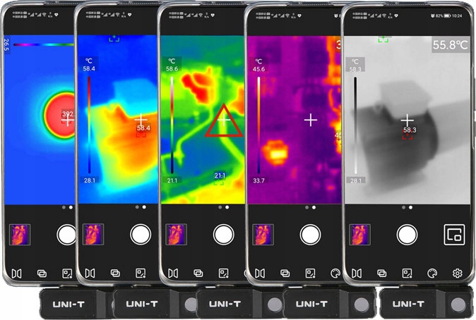 Kamera termowizyjna UTi120 Mobile to kamera termowizyjna przeznaczona do pomiaru temperatury powierzchni obiektów w zakresie od -20°C do 200°C. Kamera przystosowana jest do podłączenia do zwykłego smartfona, najlepiej wyposażonego w gniazdo USB- Złącze typu C. Możliwe jest jednak podłączenie aparatu do telefonu za pomocą dołączonych przedłużaczy USB-C/USB-C lub Micro USB/USB-C. Na wyświetlaczu telefonu komórkowego można wyświetlić obraz termiczny obiektów, przekonwertowany na obraz widzialny z wybraną paletą kolorów: żelazna czerwień, tęcza, skala szarości, gorąca czerwień, czarno-biała, lawa, tęcza o wysokim kontraście.