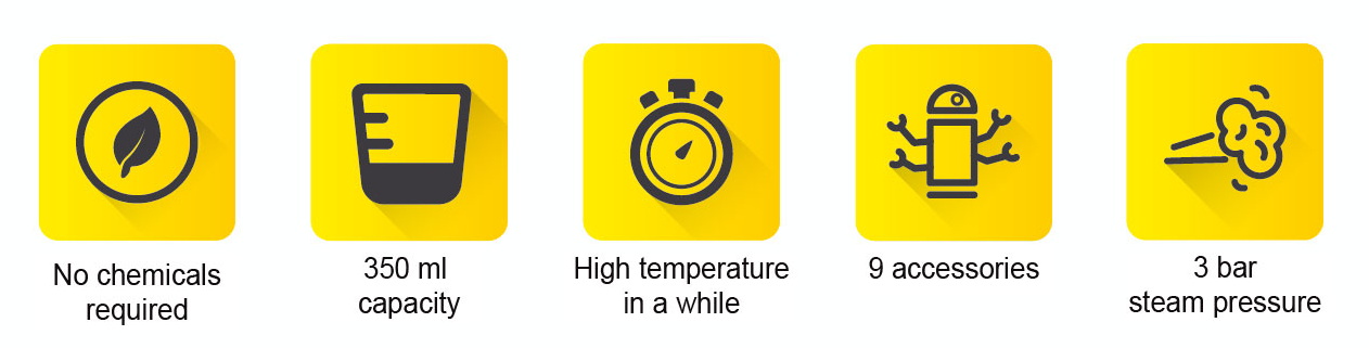 Prosta i zagięta dysza, twarda szczotka, mała okrągła szczotka, ściągacz do szyb, ściereczki - to tylko niektóre przydatne elementy tej myjki, które w niedługim czasie pozwolą Ci na błysk wyczyścić cały dom. Urządzenie szybko się nagrzewa i generuje gorącą parę wodną pod ciśnieniem 3 barów. To wystarczająca moc, by usunąć wszelkie zabrudzenia, nawet te znajdujące się w szczelinach, w zgięciach mebli lub na fugach.