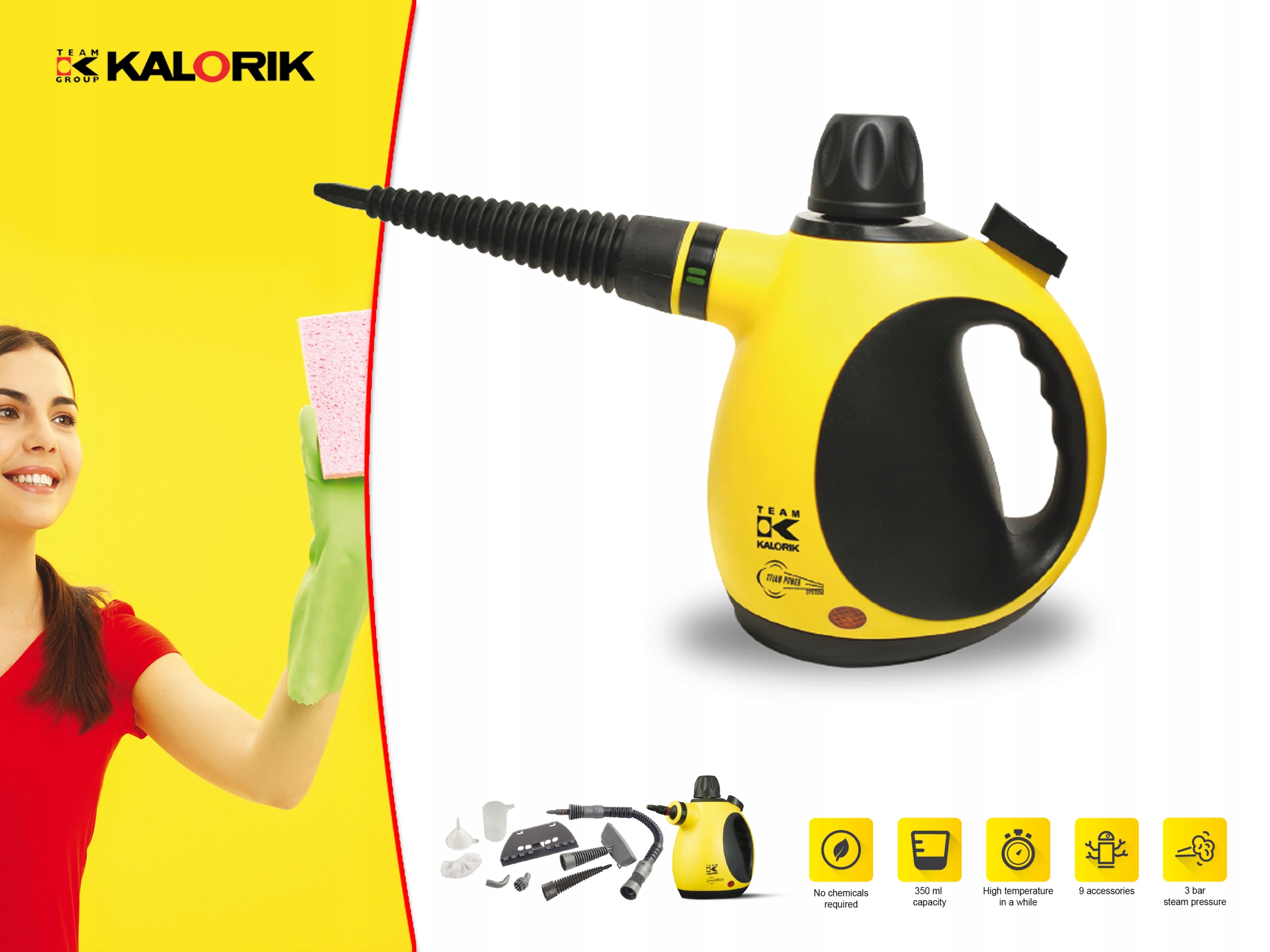 Wielofunkcyjne urządzenie KALORIK wyposażone jest w zbiornik na wodę o pojemności 350 ml, ma kompaktowy kształt, posiada lampkę kontrolną i pracuje z mocą maksymalną 1000 W. Dzięki niemu możesz całkowicie zrezygnować z czyszczących środków chemicznych i detergentów. Gorąca para zapewnia higieniczne sprzątanie, a myte powierzchnie wolne są od wszelkich patogenów jak bakterie, grzyby czy wirusy.