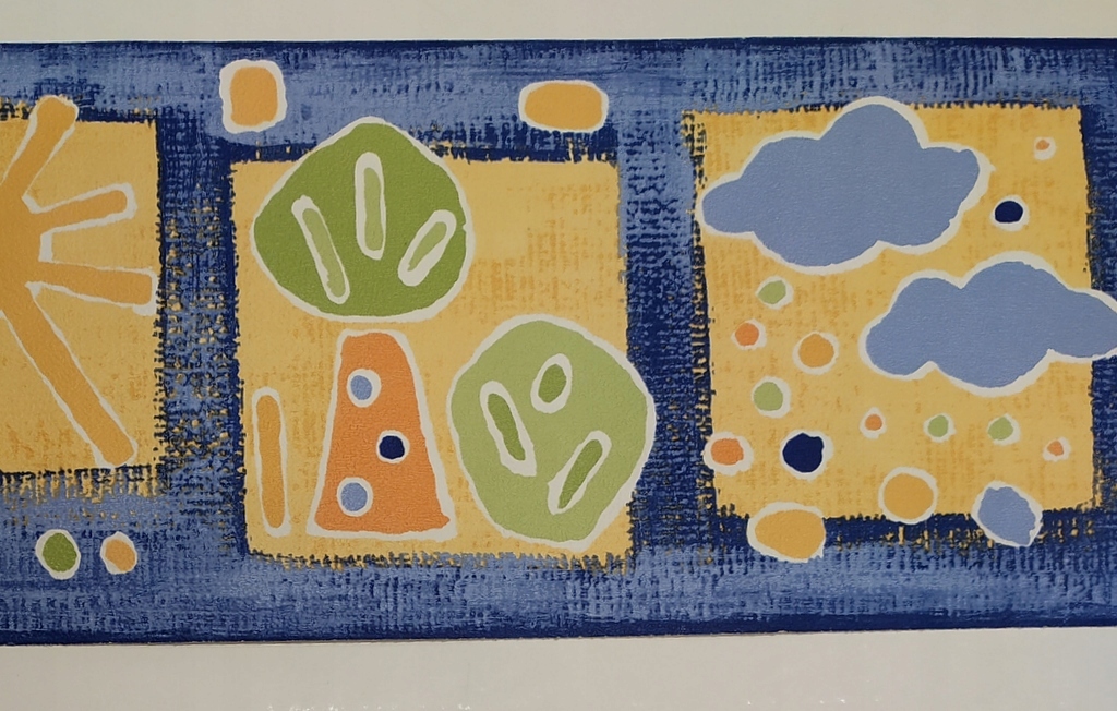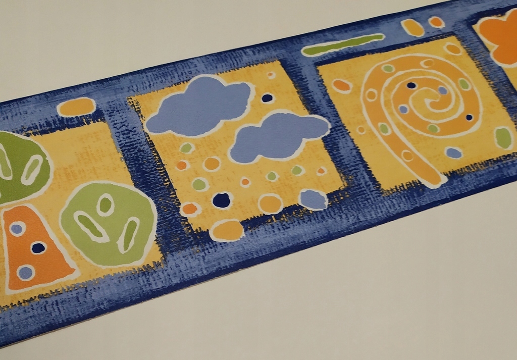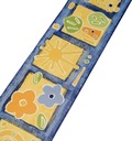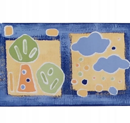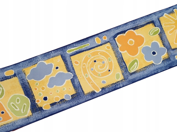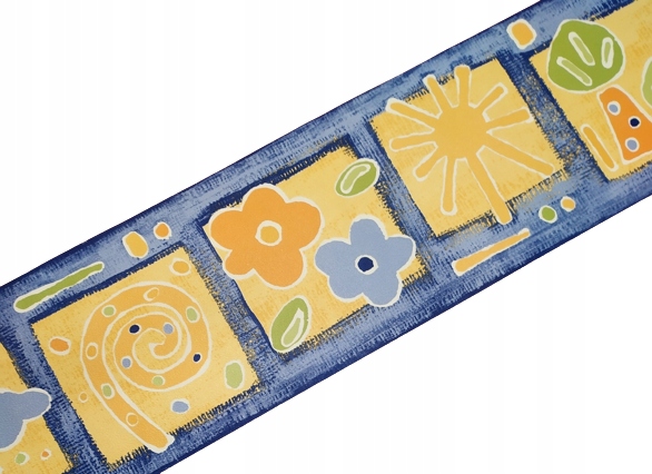 Wzór: Słońce, żółte obłoczki, kwiatki, drzewka w żółtych kwadratach. Wzorki uproszczone.Tło niebiesko-granatowe drapane.
