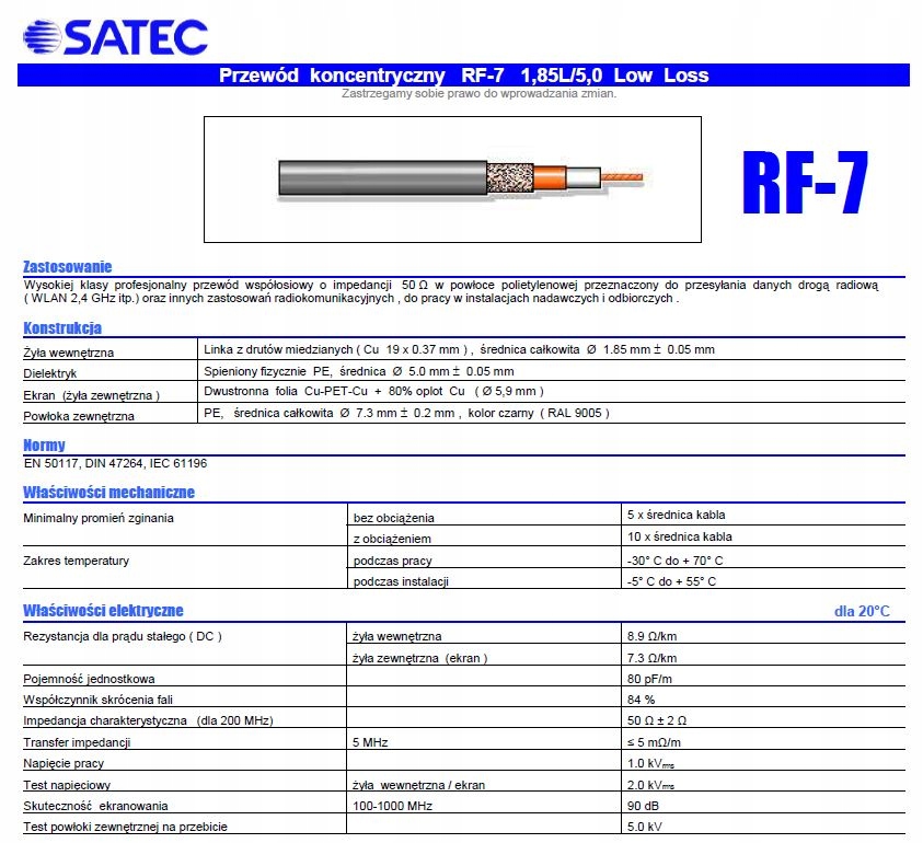 RF-7 to przewód znacznie grubszy i mniej stratny od popularnych przewodów RG58, RF-5 czy H-155, za to zbliżony parametrami do grubszego RG-213.