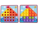 W zestawie znajduje się 12 kolorowych obrazków, 45 guziczków oraz plastikowy pojemnik do przechowywania guziczków.