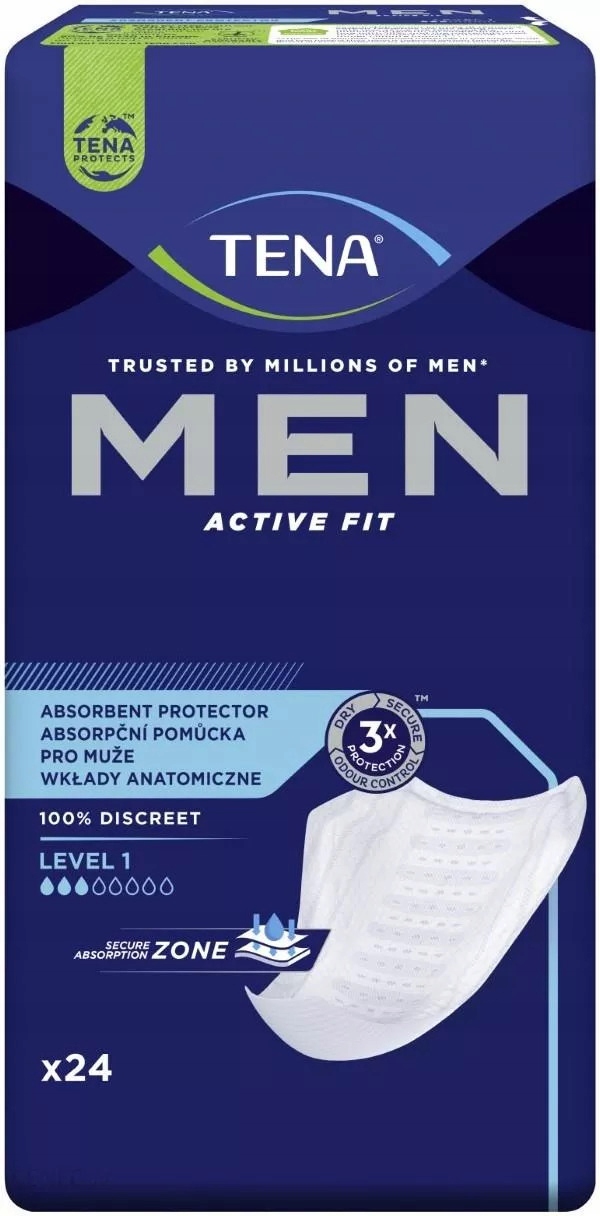 Wkładka męska TENA Men Active Fit Level 1 na niewielkie nietrzymanie moczu, chroni przed zapachem oraz wilgocią. Te w 100% dyskretne męskie wkładki mają grubość zaledwie 3,5 mm, lecz mają bezpieczną strefę wchłaniania, która skutecznie pochłania mocz.