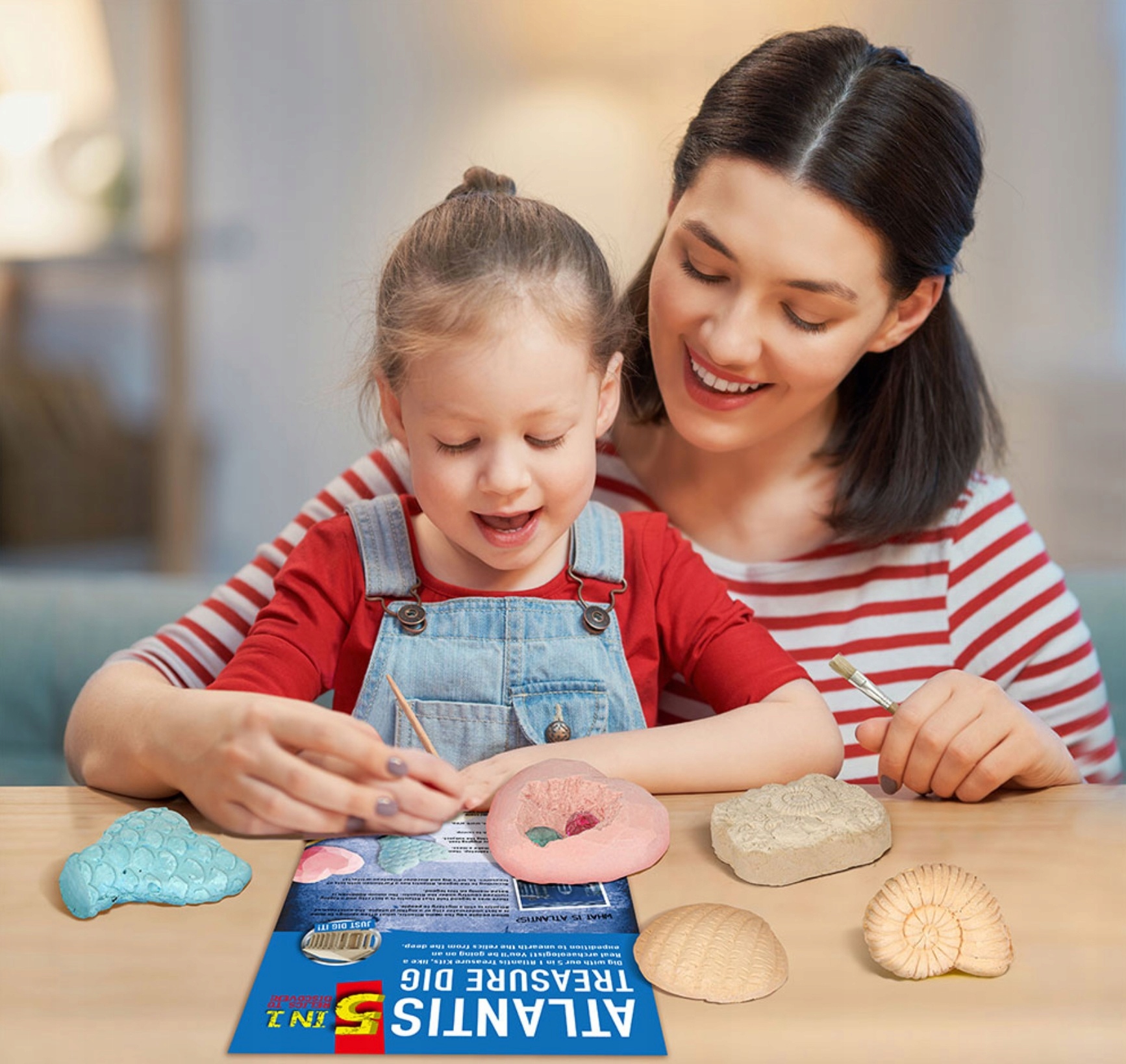 Zestaw dla młodego odkrywcy. W bryłach ukryte są skarby, które należy wykopać przy pomocy załączonych do zestawu narzędzi. Ciekawa zabawa dla młodych kolekcjonerów łącząca w sobie twórczą pracę z pasją odkrywcy. Zabawa w poszukiwanie mitycznych skarbów pobudza wyobraźnię i stymuluje do samodzielnego zdobywania wiedzy.