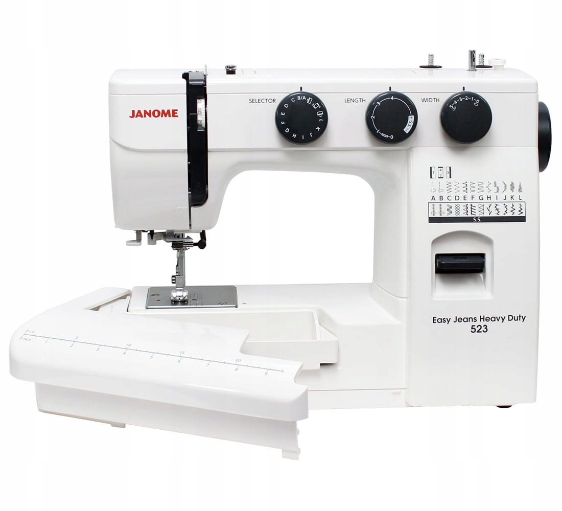 Janome Easy Jeans Heavy Duty 523 to bardzo mocna i wytrzymała maszyna do szycia o wzmocnionej konstrukcji i metalowych podzespołach. Wyposażona została w 23 najważniejsze programy ściegowe, czyli ścieg prosty, zygzak, owerlokowy, kryty, potrójnie wzmacniany, a także ściegi dekoracyjne i półautomatyczną - czterostopniową dziurkę. Wszystkie dostępne programy ściegowe możemy regulować zarówno pod względem długości, jak i szerokości dzięki czemu dopasujemy je do własnych potrzeb.