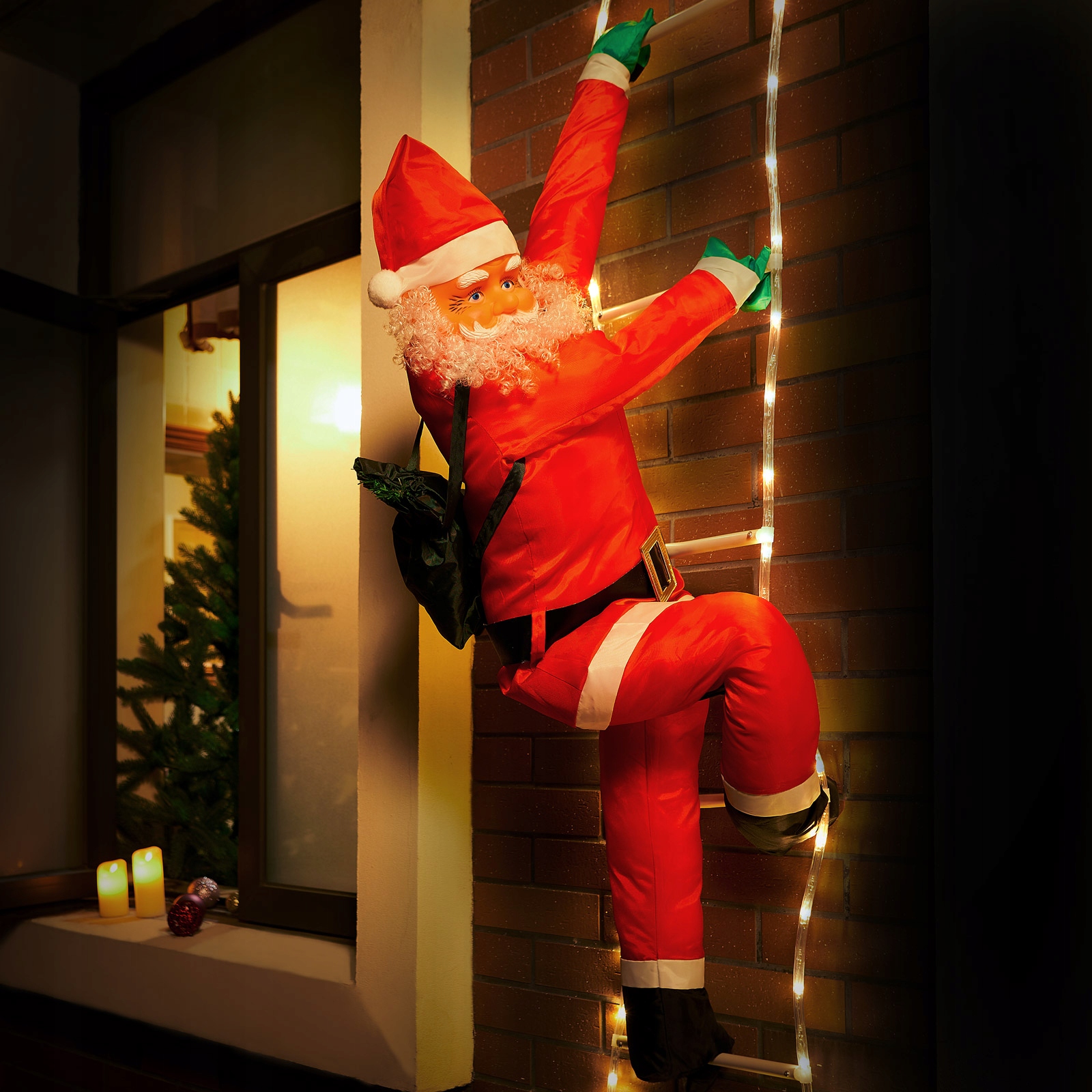 Cała drabina wyposażona jest w 120 energooszczędnych diod LED o ciepłej barwie, które eksponują Świętego Mikołaja w świątecznym świetle.