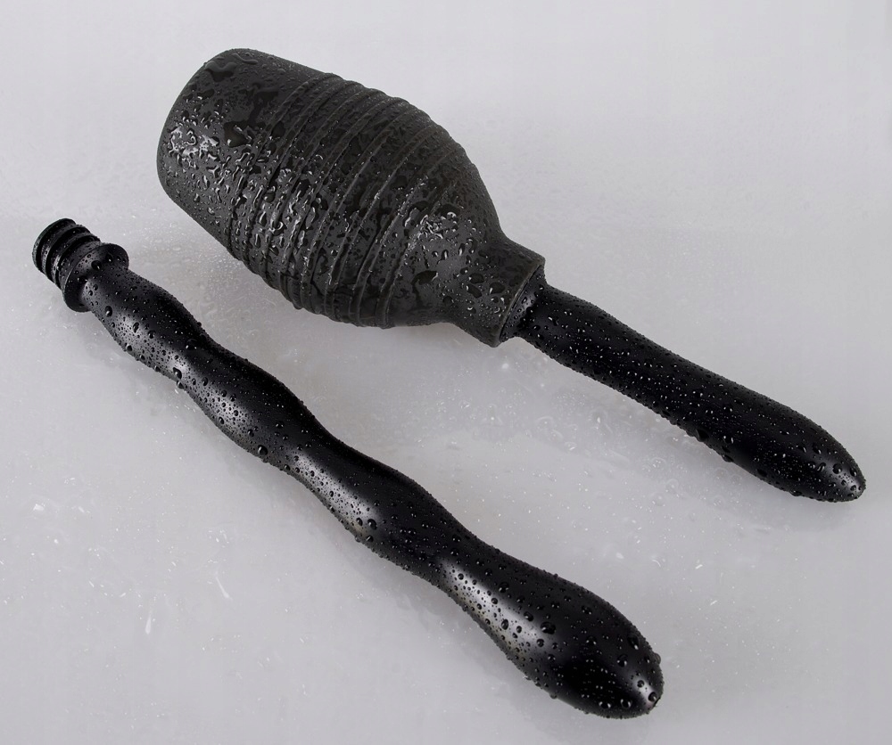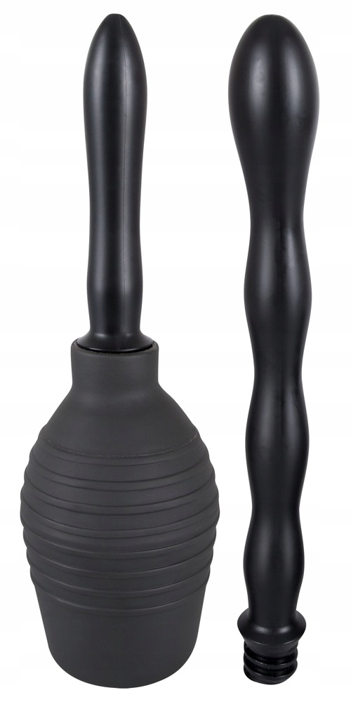 Czarny prysznic intymny (13 cm wysokości, pojemność 300 ml) z dwoma wymiennymi nakręcanymi końcówkami z dyszami natryskowymi. Łatwe do czyszczenia.