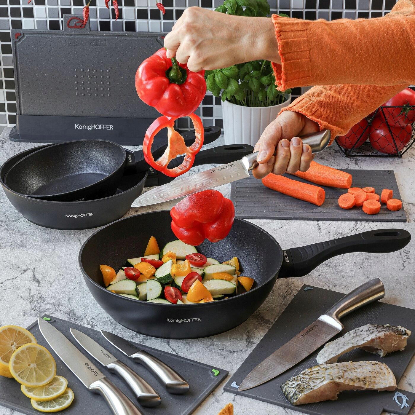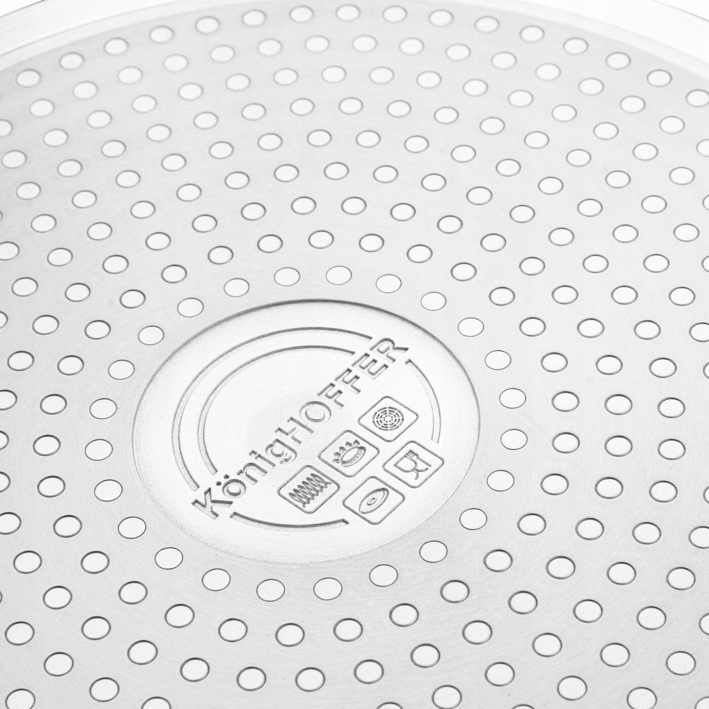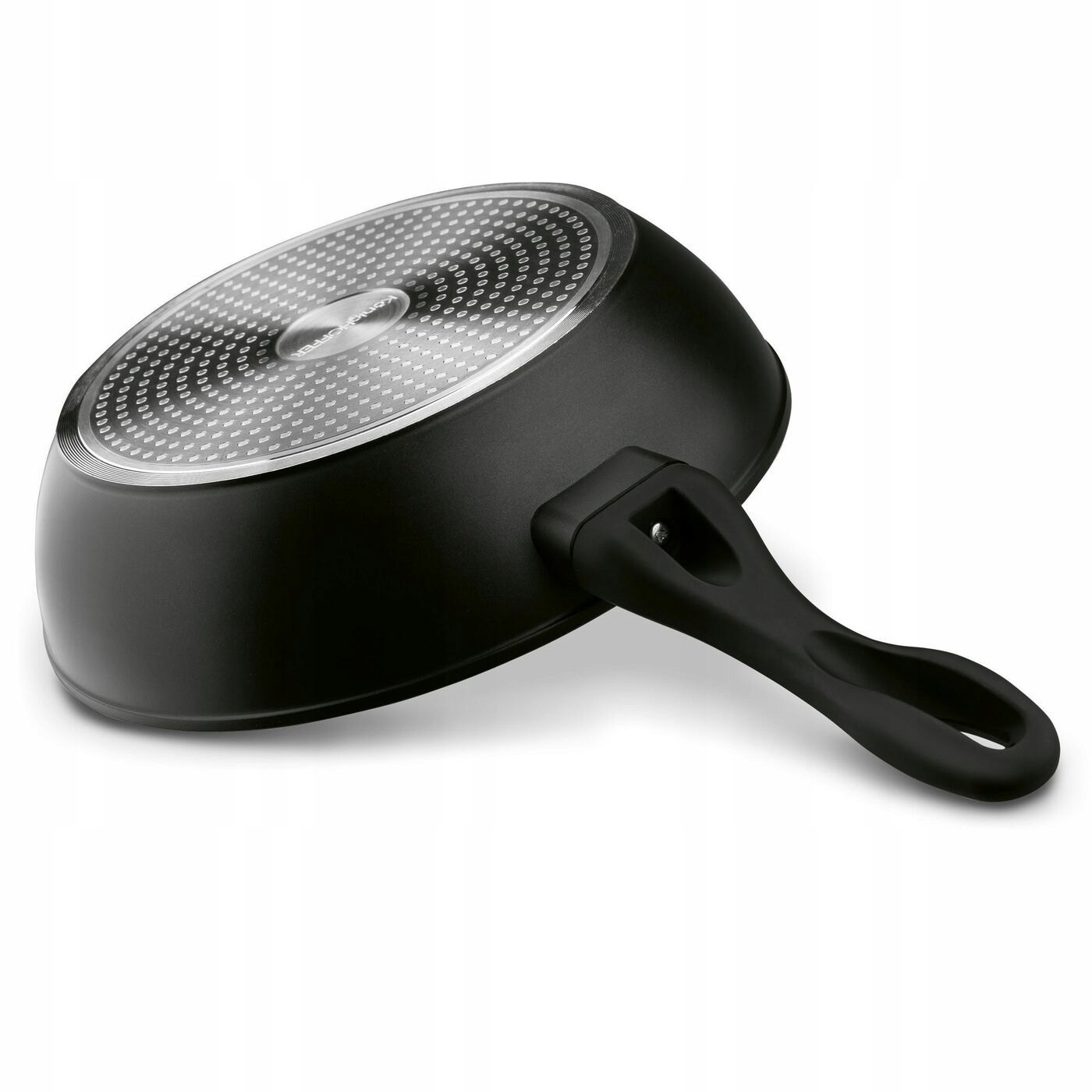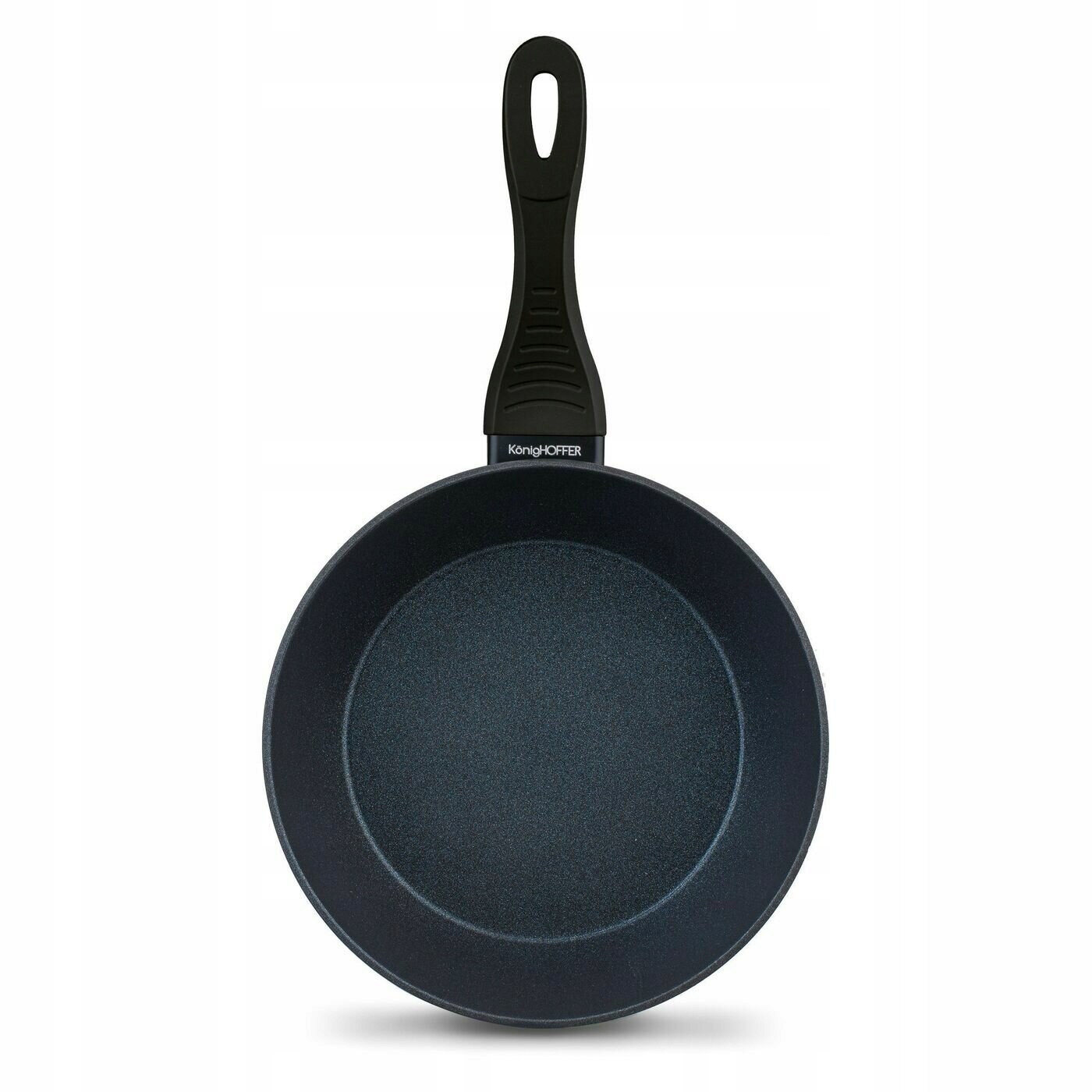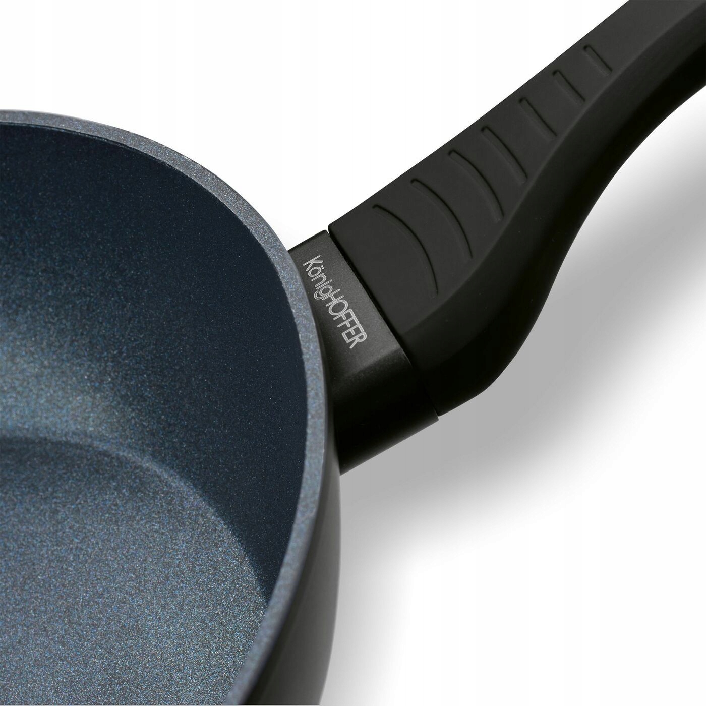 Głęboka patelnia non-stick Konighoffer Corvos 24 x 6,5 cm może być używana na indukcji oraz kuchenkach gazowych, ceramicznych i elektrycznych. Jej aluminiowy korpus został wykuty na gorąco. Dzięki temu jest dobrze wyważona, ciężka i ma solidne ścianki. Ma też dużo wyższą wytrzymałość na wysoką temperaturę i uszkodzenia. Zastosowana powłoka AEROLITE non-stick (grubość 50-65 mikrometrów) została specjalnie wzbogacona i jest PFOA Free. Jest też twardsza niż standardowe powłoki 2-warstwowe zapobiegające przywieraniu i przypalenia składników. Jej wytrzymałość sięga 50 000 cykli ścierania – jeden z lepszych wyników w skali światowej. Na patelni Corvos usmażysz, co tylko chcesz na małej ilości masła lub oliwy. Możesz też dusić składniki, ponieważ w komplecie znajdziesz dedykowaną pokrywkę szklaną z metalowym rantem i wydajnym odpowietrznikiem pary. Wygodnie zamieszasz składniki, a także umyjesz produkt. Nowoczesne wzornictwo gustownie wzbogaci twoją kuchnię – to prosta droga do komfortu tworzenia dietetycznych i lekkostrawnych posiłków. Uchwyty soft touch (patelni i pokrywki!) pokryte są warstwą silikonu i mają antypoślizgową powierzchnię. Ich konstrukcja nie nagrzewa się i dobrze chroni przed oparzeniem. Produkt ma rekomendację Ewy Wachowicz. Jako ambasadorka marki Konighoffer, gorąco i z uśmiechem poleca go ona do domowego użytku. Razem z nim zdobędziesz twój przepis na dom. To jedna z najlepszych opcji w tej kategorii!