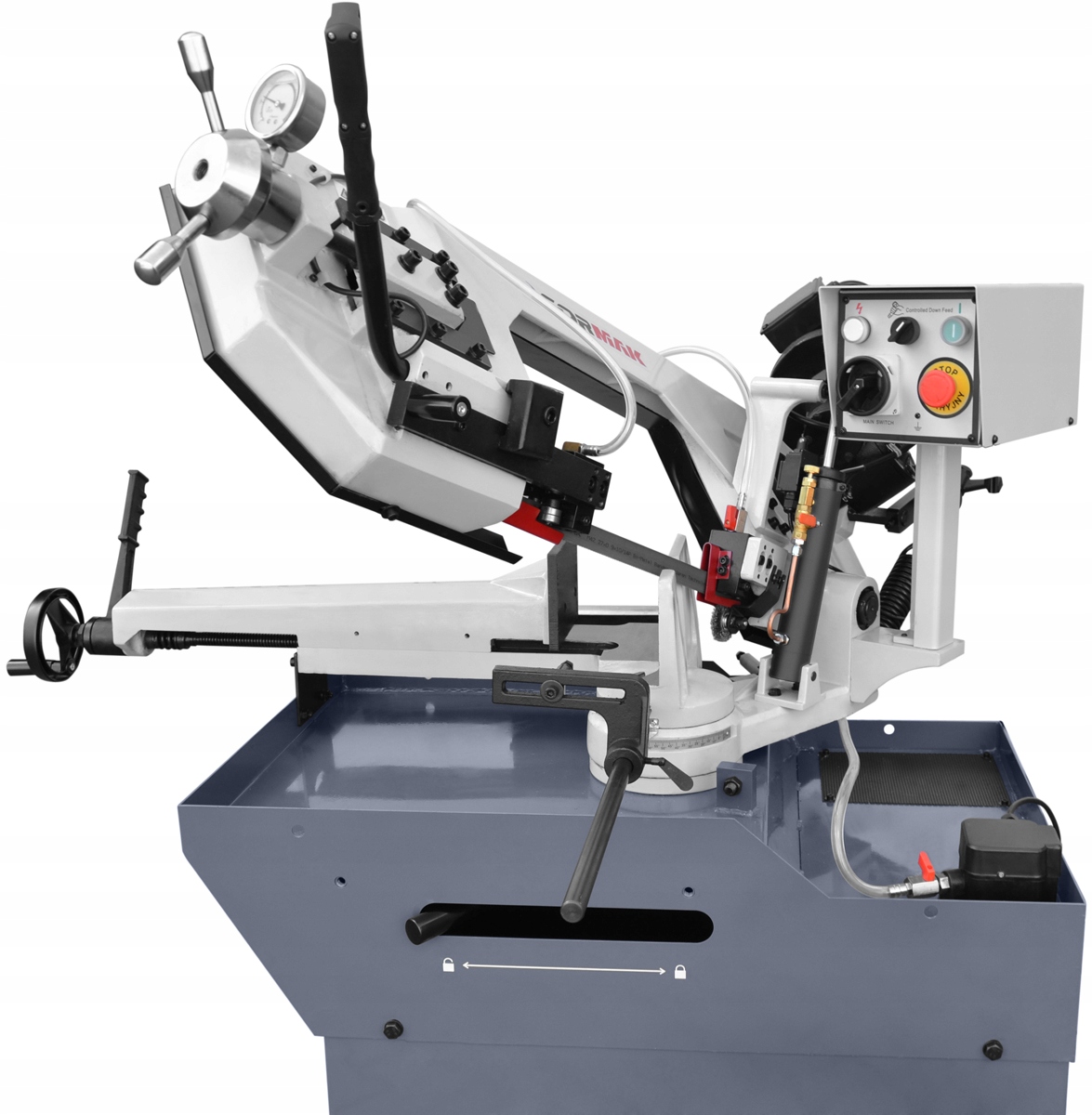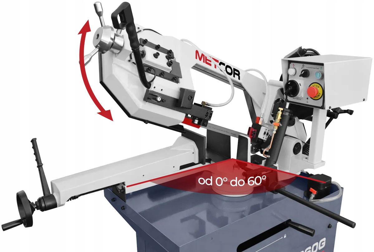 Przecinarka taśmowa do metali, pozioma ze skrętnym ramieniem umożliwia przecinanie w płaszczyźnie prostopadłej do osi przecinanego materiału i pod dowolnym kątem w zakresie od 0 do 60°.