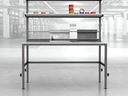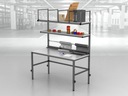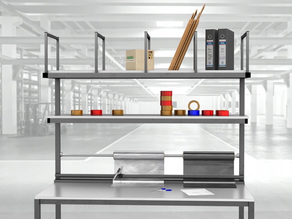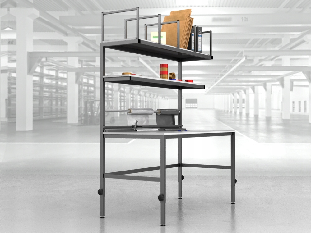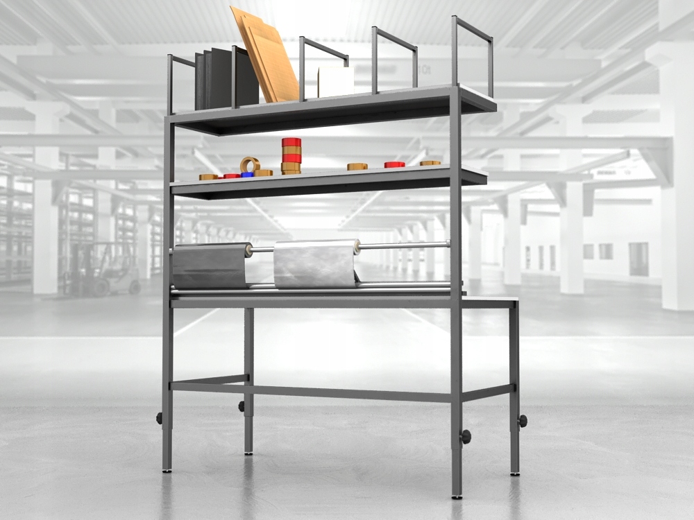 Wysokiej jakości stół warsztatowy do pakowania paczek wykonany z profili metalowych spawanych w stabilną bryłę.