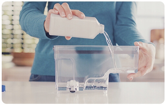 1️⃣ Wlej roztwór do usuwania kamienia Philips do zbiornika wody, a następnie napełnij zbiornik czystą wodą.