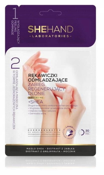 Maseczka (nasączone rękawiczki) oparta na maśle shea, glicerynie i moczniku: Połączenie ekstraktu z grejpfruta, mocznika i masła shea odżywia i wygładza dłonie oraz wyraźnie odmładza ich wygląd. Składniki aktywne docierające do głębszych warstw naskórka, pozostawiają skórę nawilżoną, miękką i delikatną na długi czas.