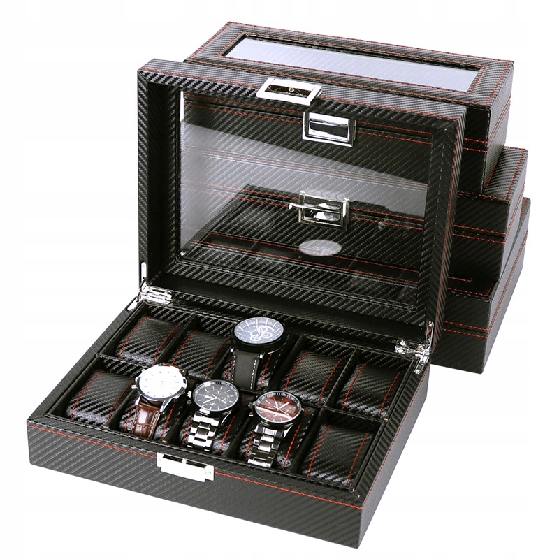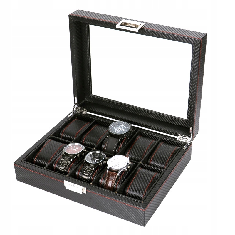 Solidne, eleganckie pudełko na 12 zegarków. Wykończone materiałem przypominającym karbon, oraz elegancką czerwoną nicią. Można w nim przechowywać zegarki lub po wyjęciu poduszeczki biżuterię lub inne drobiazgi.