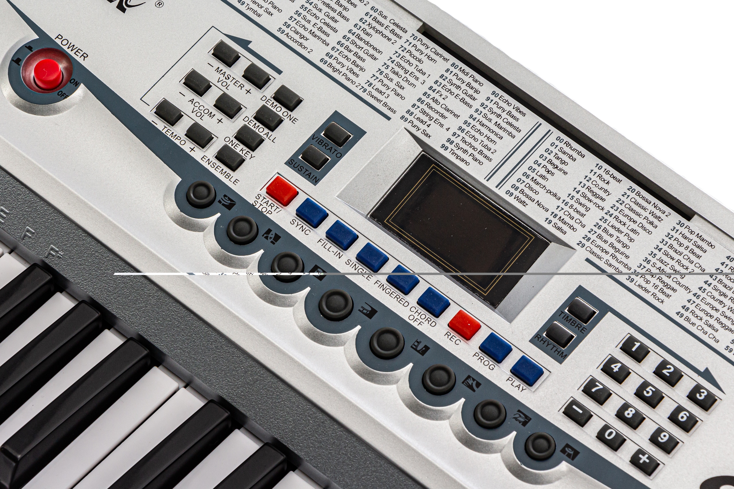 Funkcje: kontrola tempa, kontrola poziomu głośności, akordy basowe, możliwość programowania dźwięku i melodii, nagrywanie i odtwarzanie sekwencji