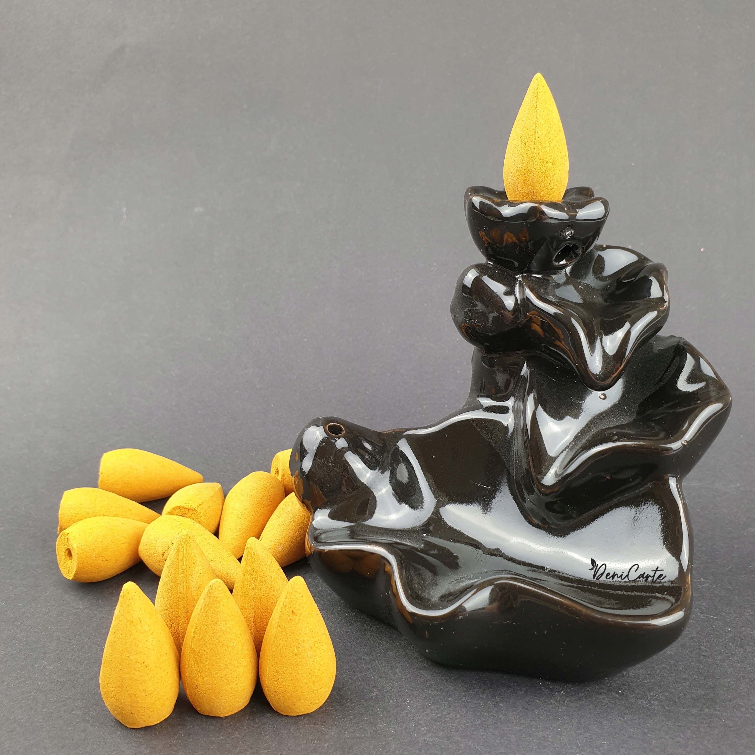 Wystarczy zapalić kadzidełko stożkowe typu backflow na czubku, umieścić je na kominku zapachowym, a dym kadzidełka, który jest cięższy od powietrza zacznie spływać w dół po krętych żłobieniach, tworząc niesamowity efekt dla oczu.