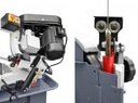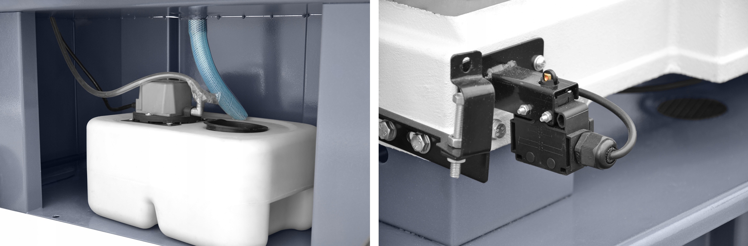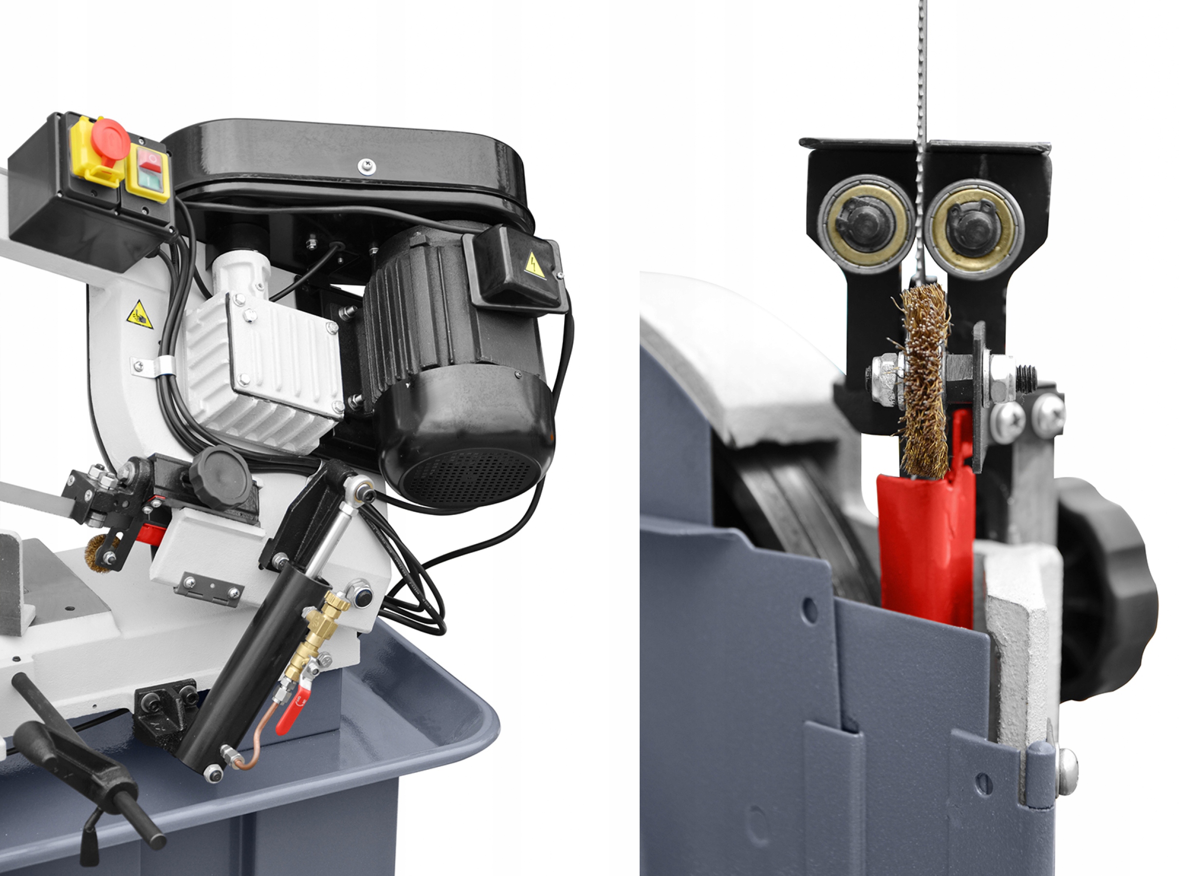 В нижней части пьедестала машины находятся отверстия для осей колес. Безопасность во время процесса резки обеспечивает электрическая установка, отвечающие всем требованиям CE. Машина имеет концевой выключатель, остановившиеся машины после окончания процесса резки, аварийный выключатель, так называемые ”грибок безопасности”, серию микровыключателей, отключающие машину, если, например: откроем крышку ременной передачи или крышку режущей ленты. Кроме того, наша модель машины, в отличие от конкуренции оснащен проволочной щеткой очистки режущая лента из стружки-это предотвращает забиванию полотна и эффективное резание.