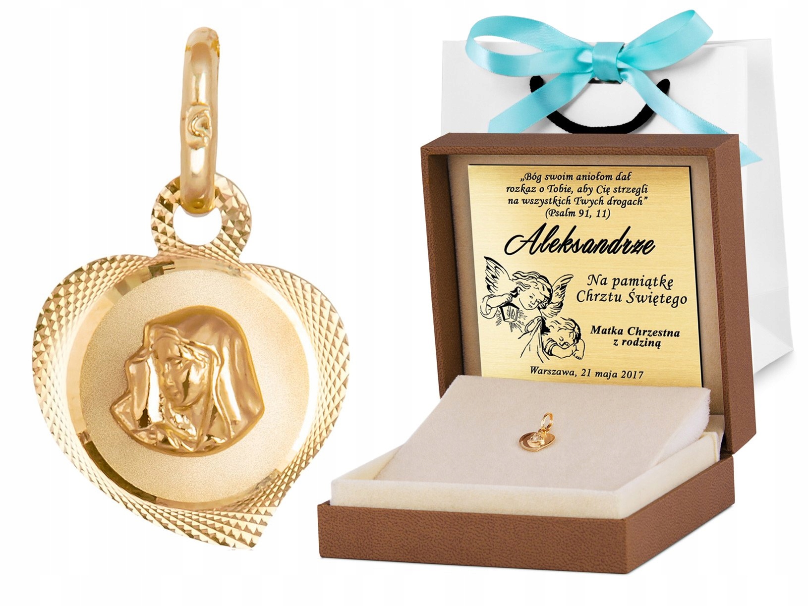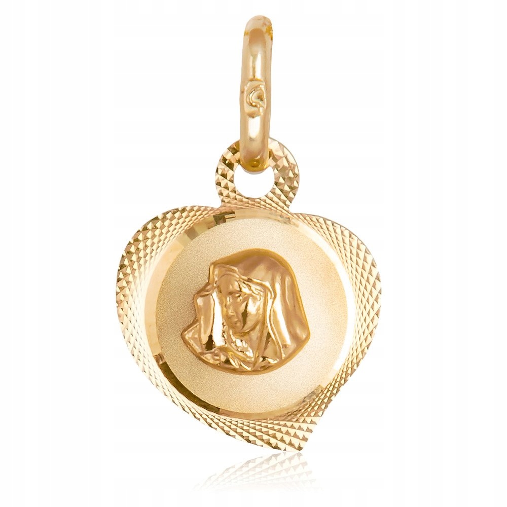 Medalik przedstawia postać Matki Boskiej skomponowaną w kształcie serca, co symbolizuje bezwarunkową miłość i oddanie w wierze. Dzięki temu znakomicie może podkreślić sakralne okazje lub wkroczenie na nową drogę życia. Może stać się również pomysłem na chrzest uwypuklającym uroczyste przyjęcie wiary chrześcijańskiej przez nowo narodzonego członka rodziny. Geometryczny wzór wykonany techniką diamentowania zwieńcza subtelny kształt serca wzbogacając go o połyskującą poświatę. Medalik wykonany jest ze złota próby 585 co poświadczają załączone metki jubilerskie z podaną próbą kruszcu, zbadaną przez Polski Urząd Probierczy.