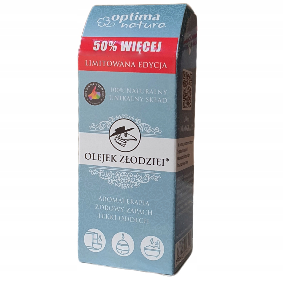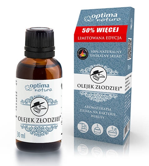 Olejek Złodziei ® składa się z 6 naturalnych olejków eterycznych goździkowego, cynamonowego, cytrynowego oraz z kory i liści eukaliptusowego i rozmarynowego. Olejek ten doskonale poprawia mikroklimat i jakość powietrza w pomieszczeniu, wypełniając je pięknym orzeźwiającym zapachem, a także wspaniale sprawdzi się w masażu aromapetycznym oraz kąpieli. Olejek ten pomaga podczas infekcji sezonowych.