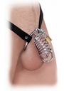 Сначала надеваем кольцо на яички и пенис, затем прикрепляем клетку.