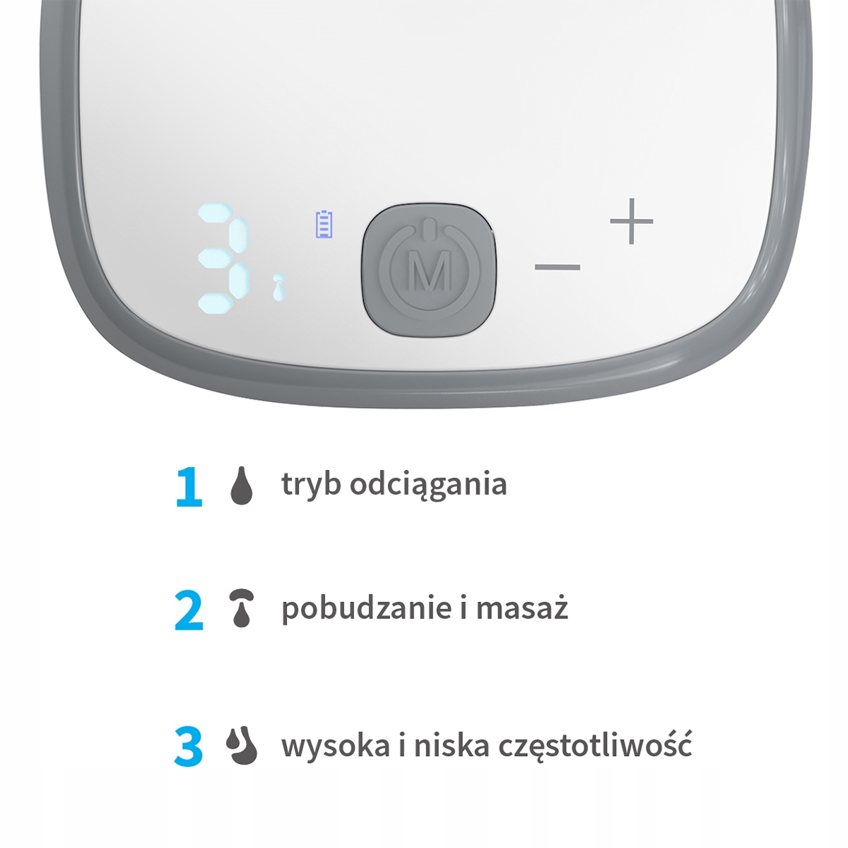 2. Tryb 2 w 1 - cykl złożony z 8 ruchów masujących, po których następuje 1 ruch ssący. Tryb ten zalecany jest do kojenia bólu przepełnionych piersi i pobudzeniem ich w celu odciągania większej ilości pokarmu w krótszym czasie.