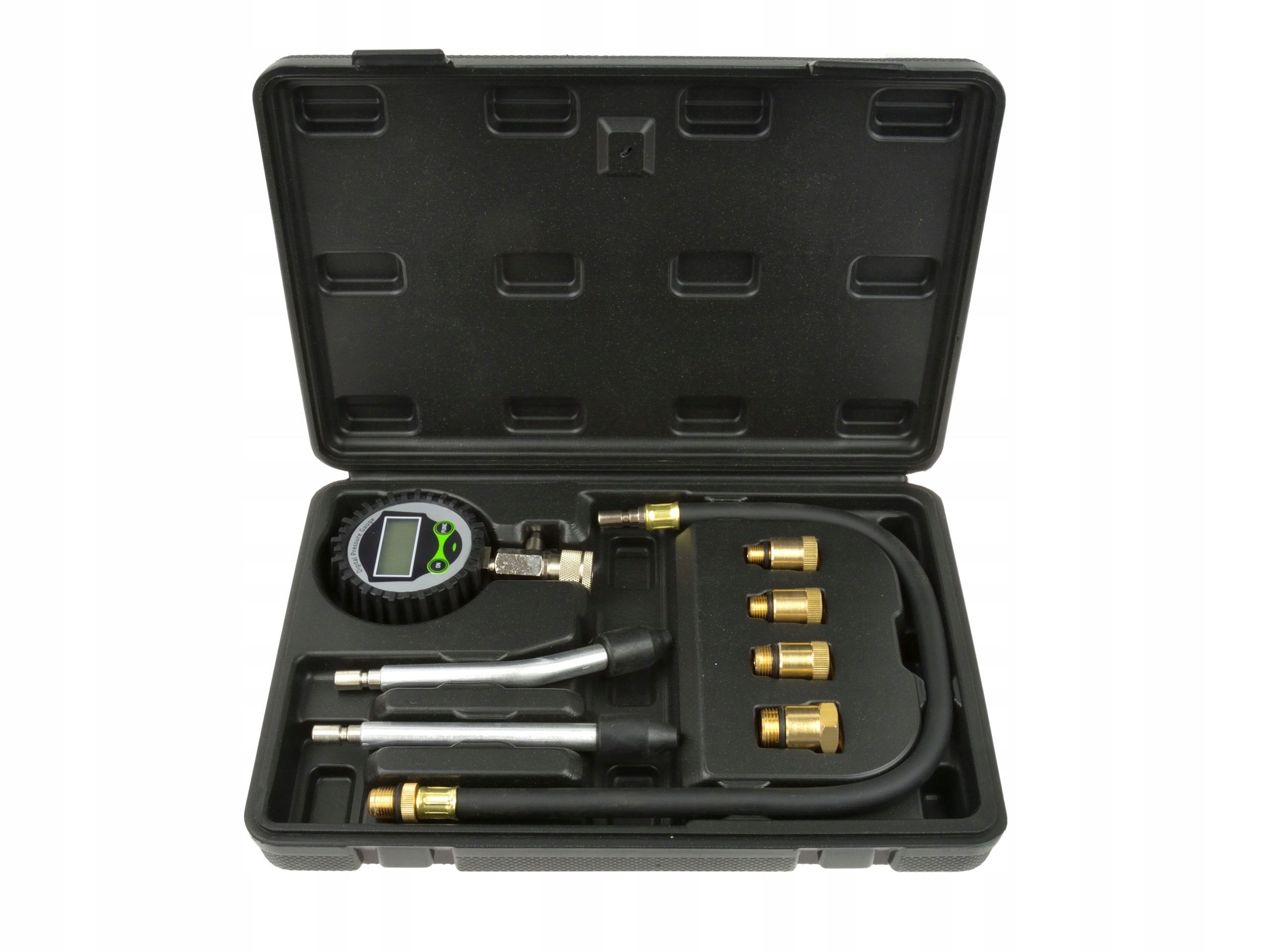 Tester pomiaru ciśnienia sprężania w silnikach z zapłonem iskrowym w samochodach i motocyklach z silnikiem benzynowym. Manometr z czytelnym wyświetlaczem LCD, wskazuje wartość pomiaru (w jednostkach: psi, Kpa, Bar, Kgf/cm²) oraz stan naładowania baterii.